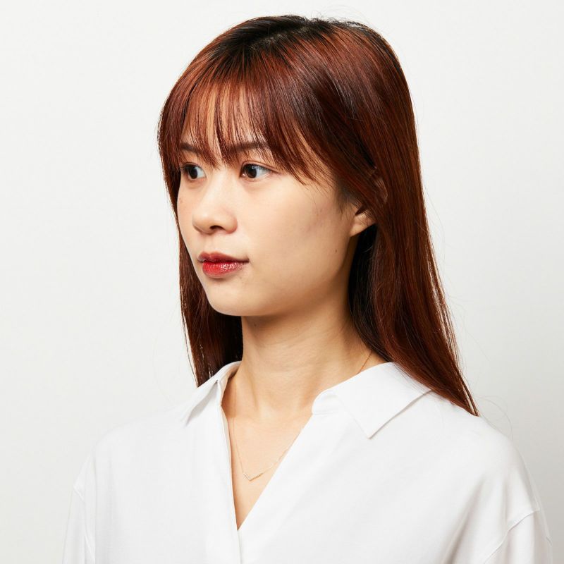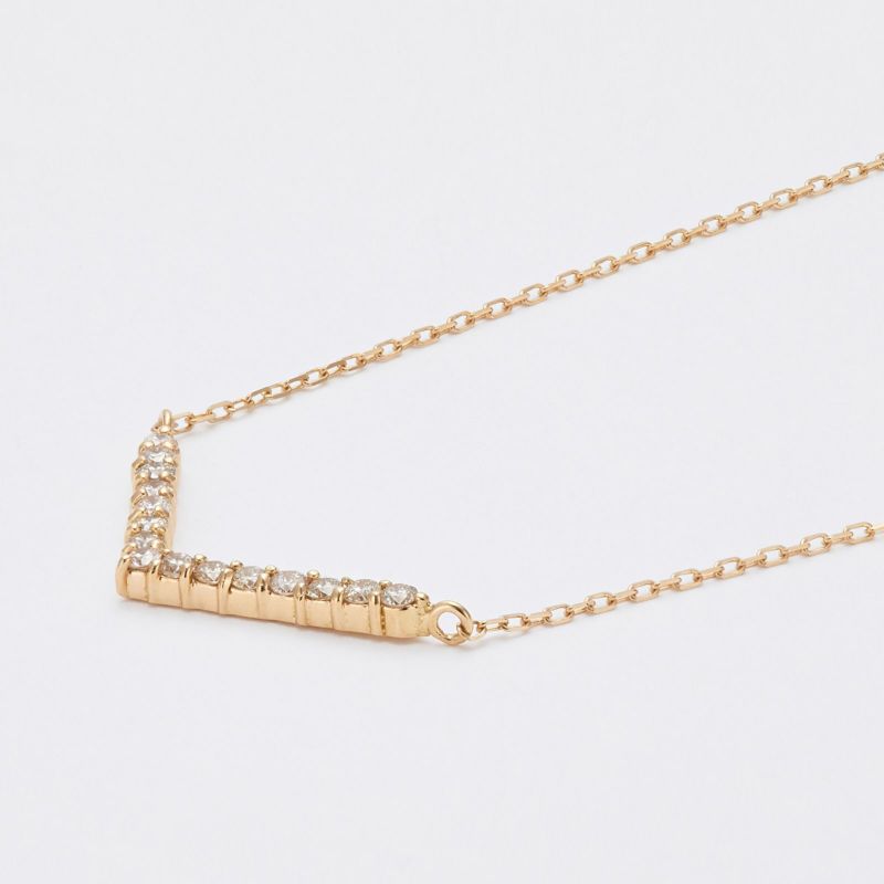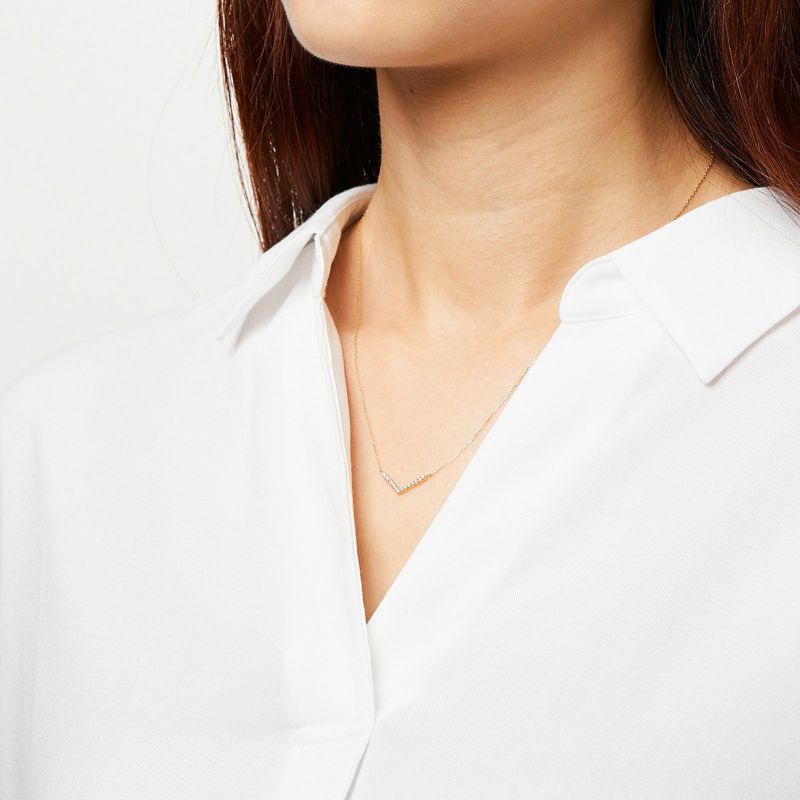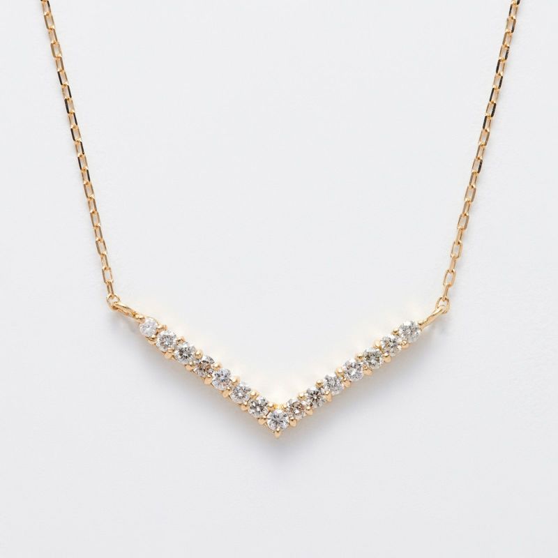 Vラインに並んだダイヤが顔周りをシャープに見せるK18 イエローゴールドのペンダントネックレス。シンプルに1本でもお使いいただけますが、重ね付けとも相性のいいデザインです。