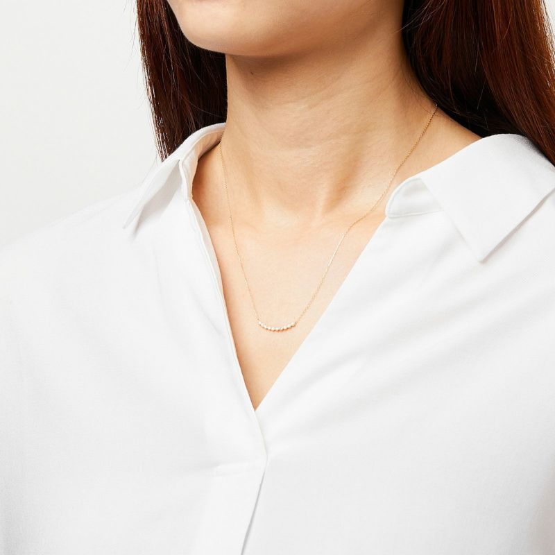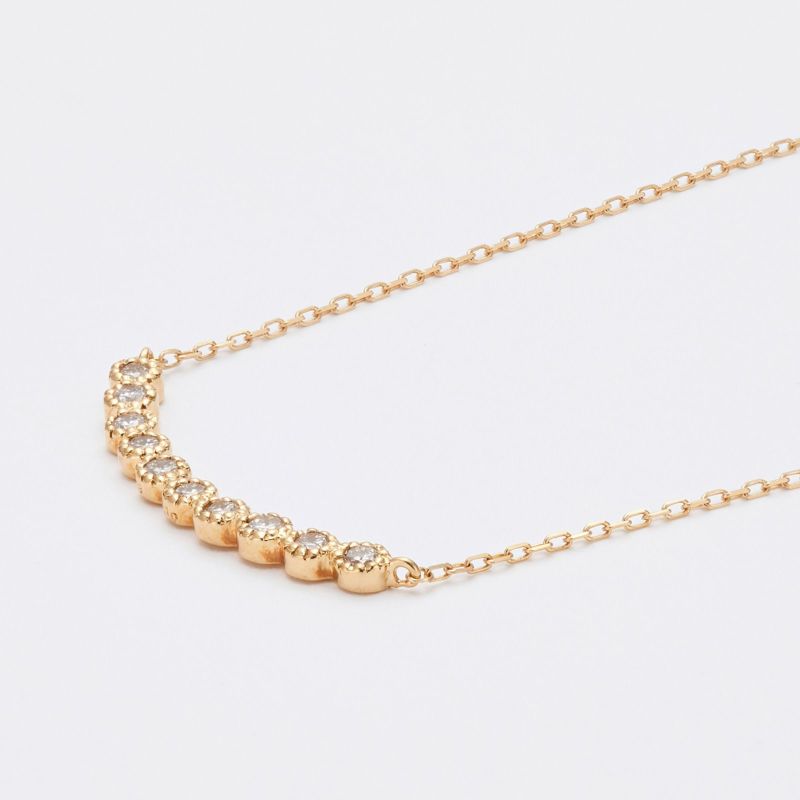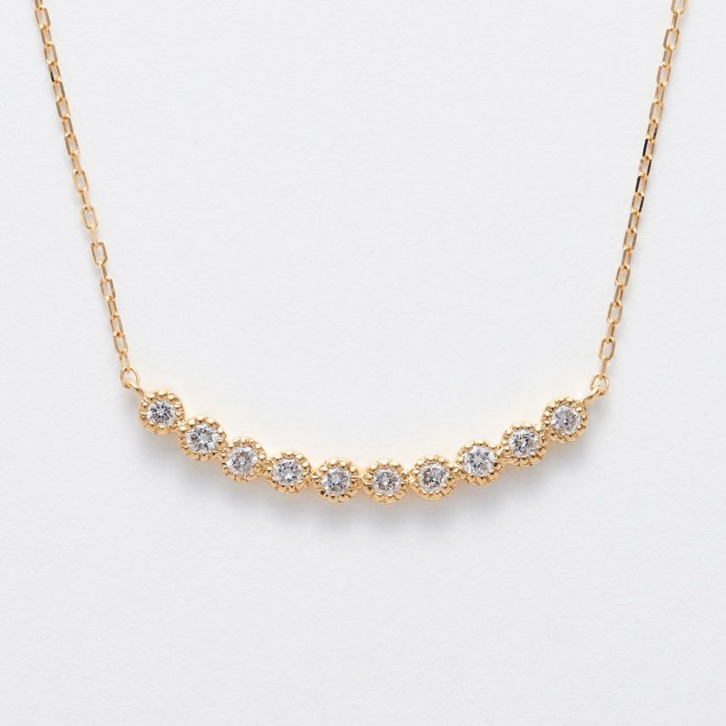 合計0.1ctのゆるやかなカーブを描くダイヤが華やかなペンダントネックレスです。ダイヤの周りがミル打ちされていて、きらびやかな雰囲気。愛らしい魅力を引き出すネックレスです。