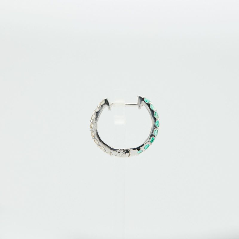 エメラルドとダイヤモンドのK18ホワイトゴールドリバーシブルフープピアス。全体的に色が足りないかな、アクセントが欲しいな、という時はエメラルドを、少し落ち着いた雰囲気にしたいな、という時はダイヤモンドを前面にして違う表情を楽しんでください。