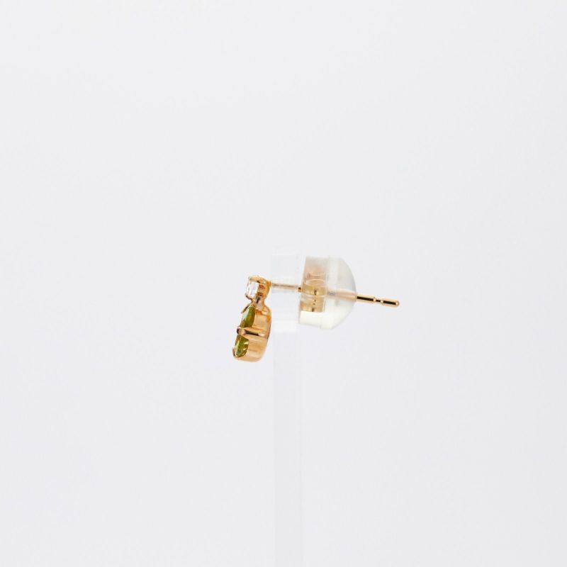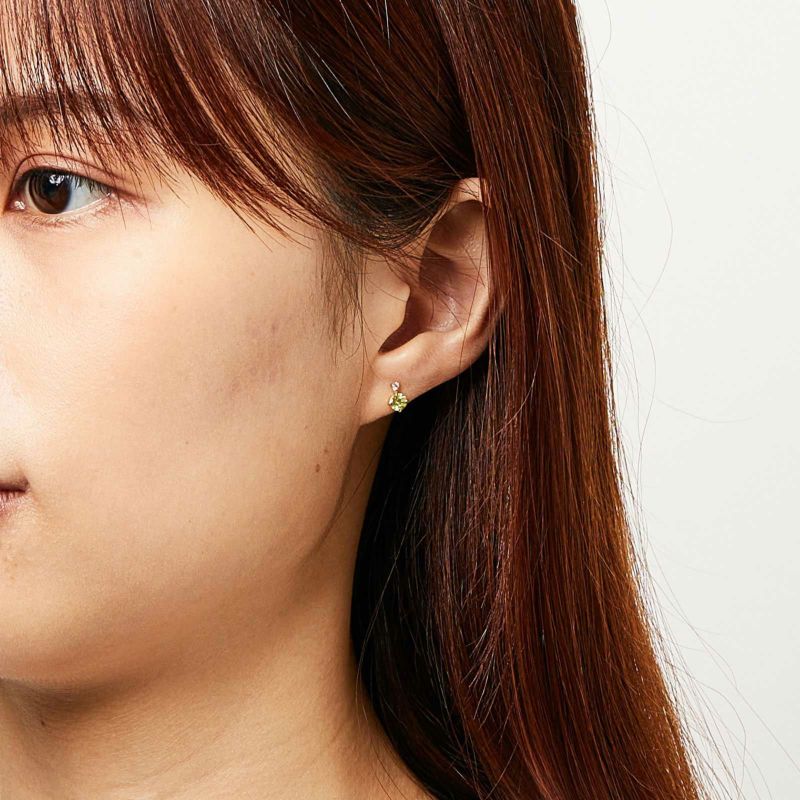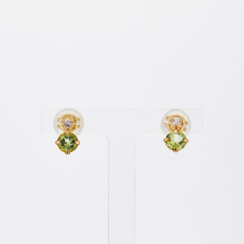 ラウンドカットのペリドットの上に、きらりと光る小さなホワイトトパーズがアクセント。顔周りにカラーストーンのジュエリーを使うと華やかな印象になります。フレッシュなマスカットのようなきれいなペリドットをぜひ耳元に。