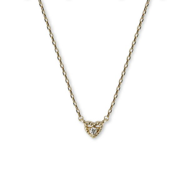 女子なら一つは持ちたい、かわいいハートモチーフ。一粒ダイヤの周りをぐるりと囲むミルグレインが、胸元を可愛らしく演出してくれる。