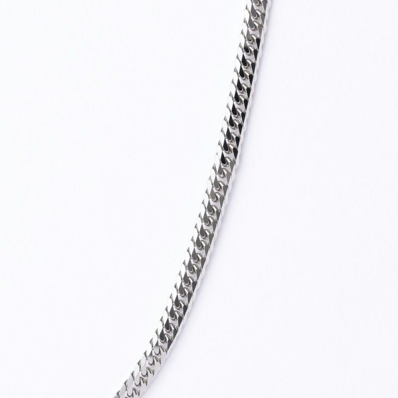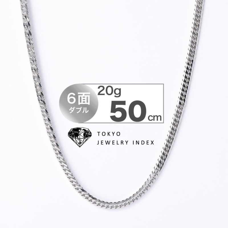 上下左右にカットを施した、輝きのある6面カットプラチナ喜平ネックレスです。幅広く見え、カットが多い分輝きが増すのが特徴です。20gのシンプルなチェーンはユニセックスにご愛用いただけます。独立行政法人造幣局の検定マーク(※ホールマーク)入り。