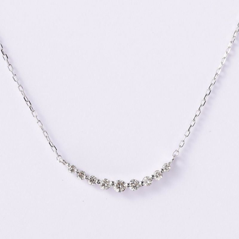 9石のダイヤモンドを並べたシンプルなネックレスです。ダイヤモンドがグラデーションになっているので、洗練された印象になっています。横型のネックレスは、デコルテを綺麗に見せてくれるといわれています。横ラインのネックレスは重ねても楽しめるので、お持ちのアイテムとあわせてお使いください。