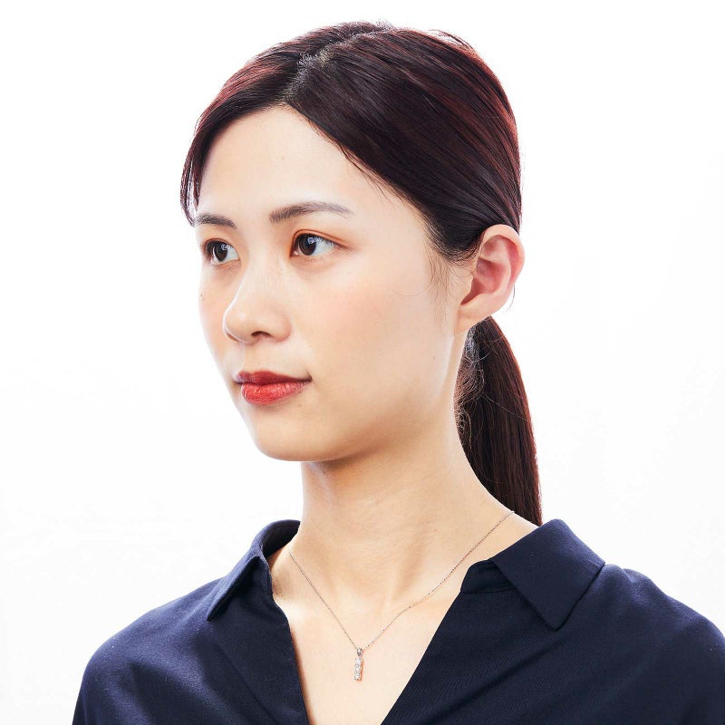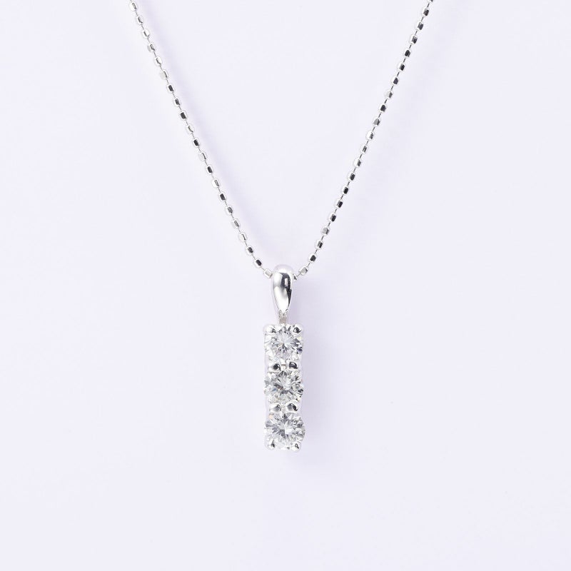 大きさの違う3石のダイヤモンドを縦に配置したネックレス。スリーストーンは過去、現在、未来の意味があります。過去の自分、今の自分、未来の自分にご褒美をあげて。