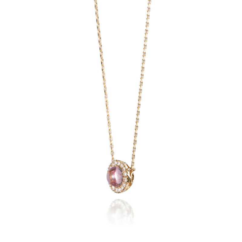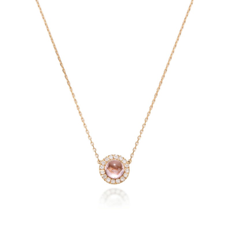マイクロセッティングのメレダイヤモンドの中心に美しいカラーのピンクトルマリンを留めました。プレシャスという最愛の人という意味の名前が付けられたこちらのネックレスは、12ヶ月分のご用意がございます。お守り石としても、プレゼントとしてもご愛用下さい。
