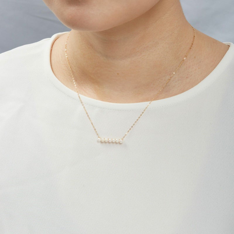 7石のあこやベビーパールを並べたネックレスです。小ぶりなベビーパールが直線に並び、洗練された印象でお召いただけます。ベビーパールの色味をそろえていますので、一様に美しい色味を楽しんでいただけます。