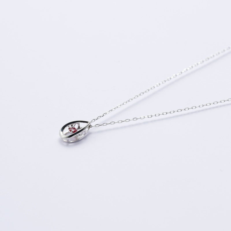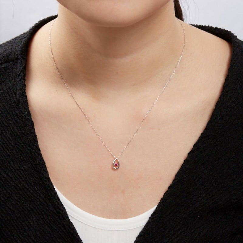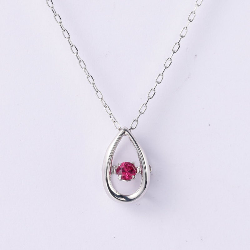 ドロップ型のペンダントトップにルビーを留めたシンプルなダンシングストーンネックレスです。ルビーの赤を存分に楽しんでいただける、品のあるデザインに仕上げました。アジャスター付きなので、長さの調整も自在です。