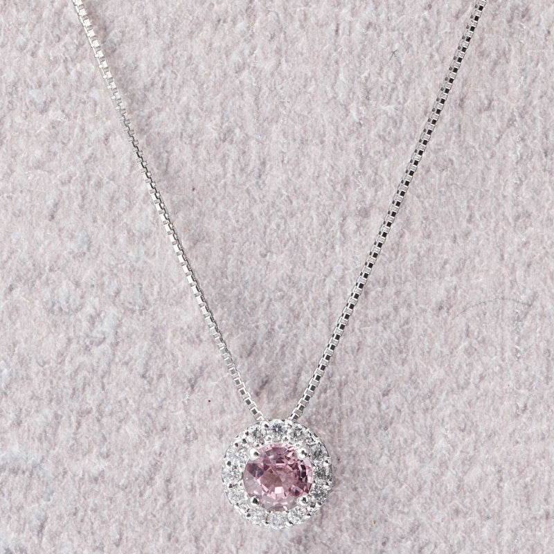 希少性の高いパパラチャサファイアをダイヤモンドで取り巻いた、プラチナのペンダントネックレス。気取らずに使っていただける定番のデザインです。