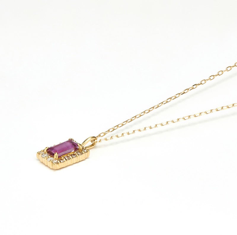 バゲットカットのルビーがメレダイヤモンドとK18イエローゴールドのフレームで囲まれた美しいネックレス。さりげなく可憐なアイテムです。