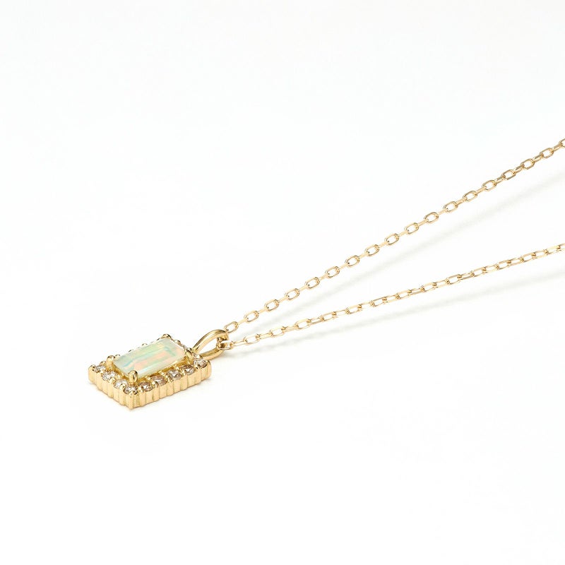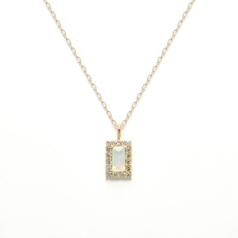 バゲットカットのオパールがメレダイヤモンドとK18イエローゴールドのフレームで囲まれた美しいネックレス。さりげなく可愛らしいアイテムです。