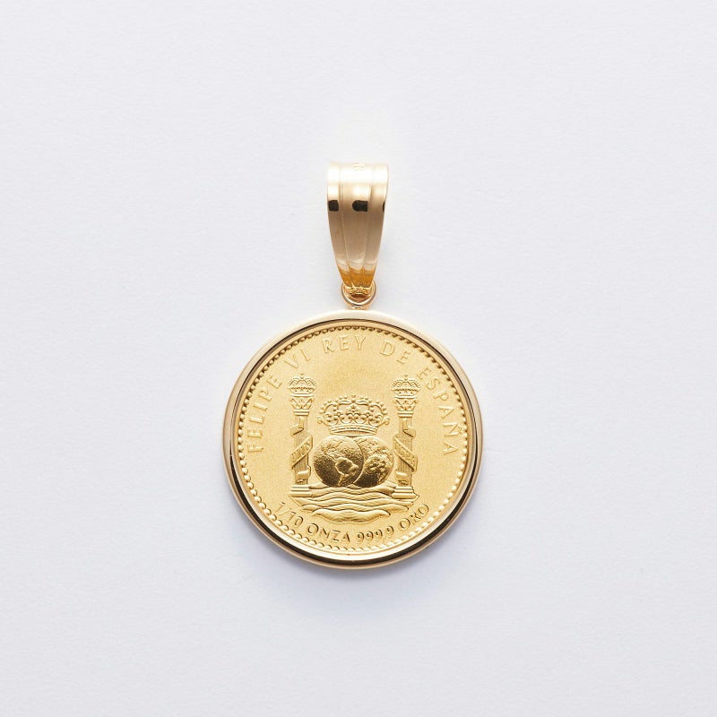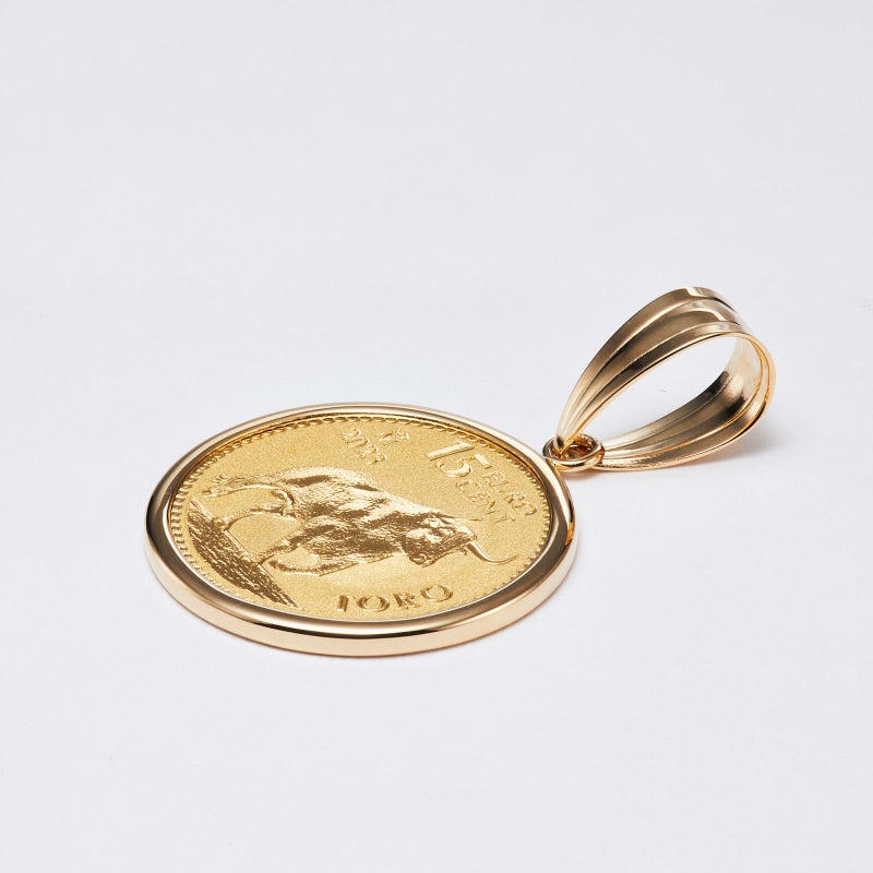 K24イエローゴールド /ブル ダブロン金貨 /トロ /15ユーロセント/ 2023年製 スペインマドリード王立スペイン造幣局発行のコインペンダントトップです。K18イエローゴールドのシンプル枠でありながら重厚感のある闘牛を引き立てたペンダントトップになっています。