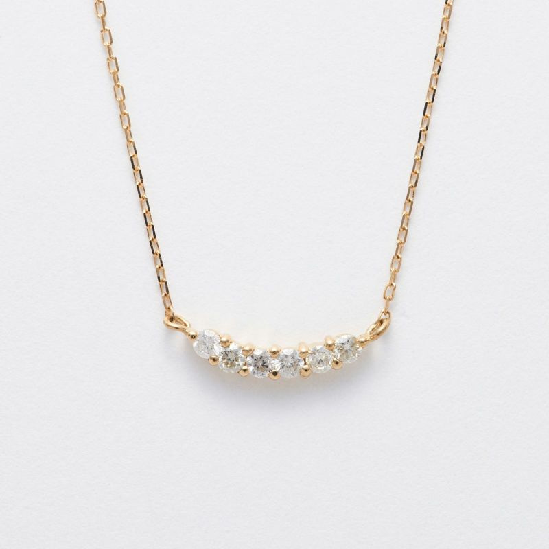6粒合計0.1ctのメレダイヤが緩やかなラインを描いて並んだペンダントネックレス。主張しすぎないデザインはどんな装いにも使いやすく、お気に入りの1本になること間違いなし。ダイヤの本物の輝きが装いをランクアップさせてくれます。