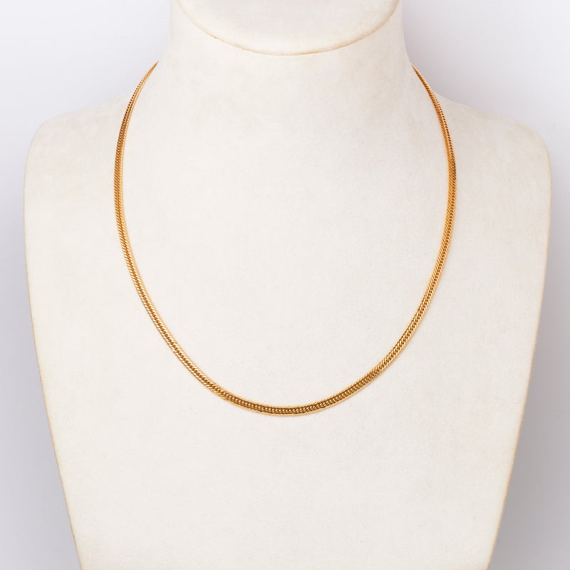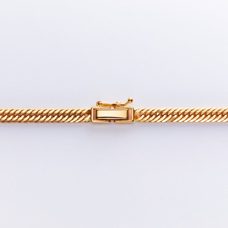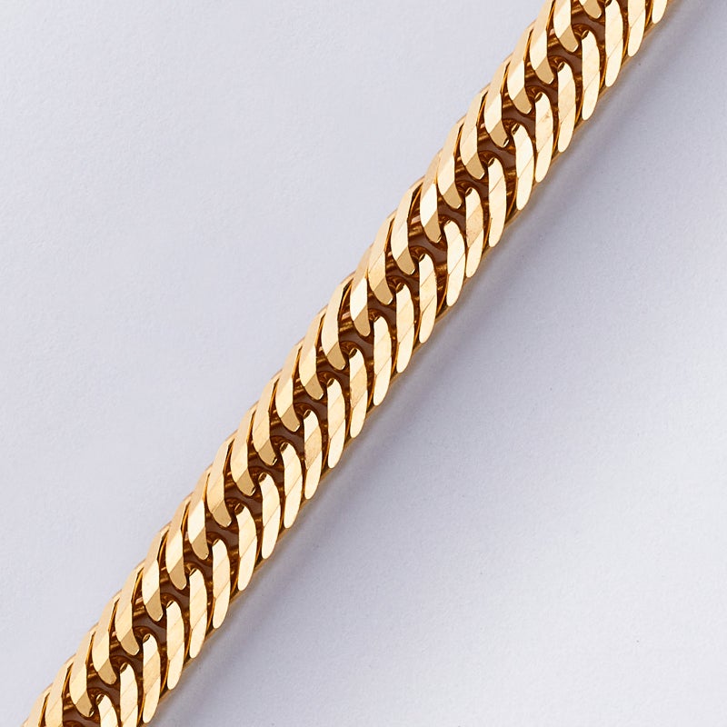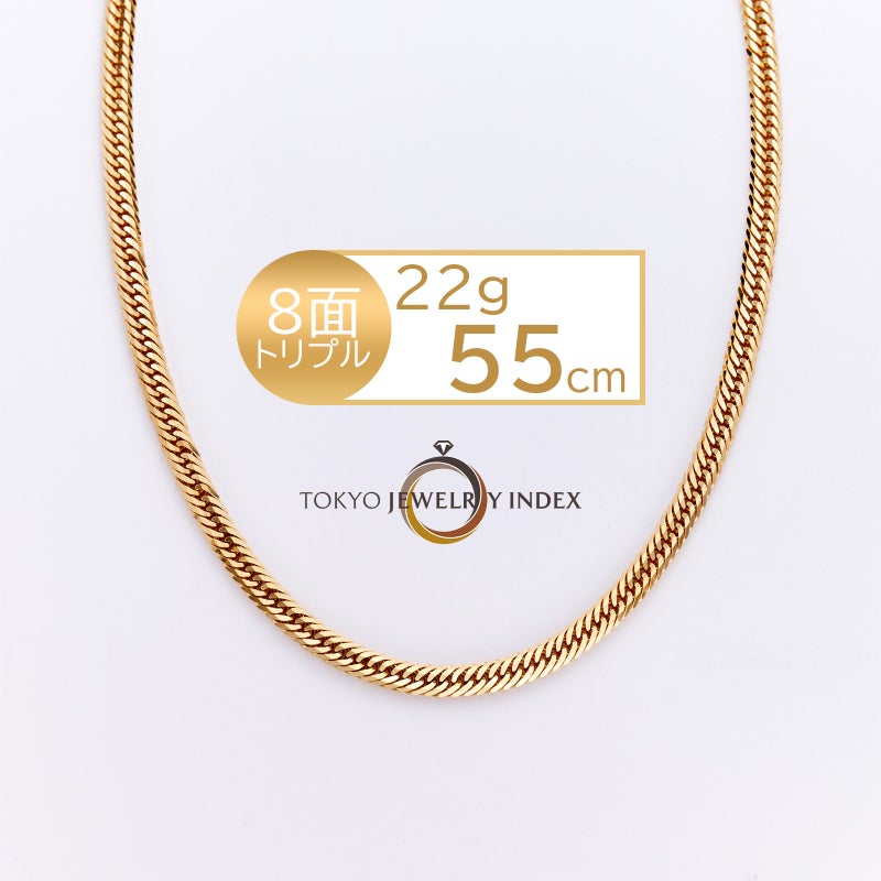 地金素材 :K18イエローゴールドカット数 :12面編み方 :トリプル重量(g) :22g長さ(cm) :55cm留め具 :中留め幅(mm) :3.8mm