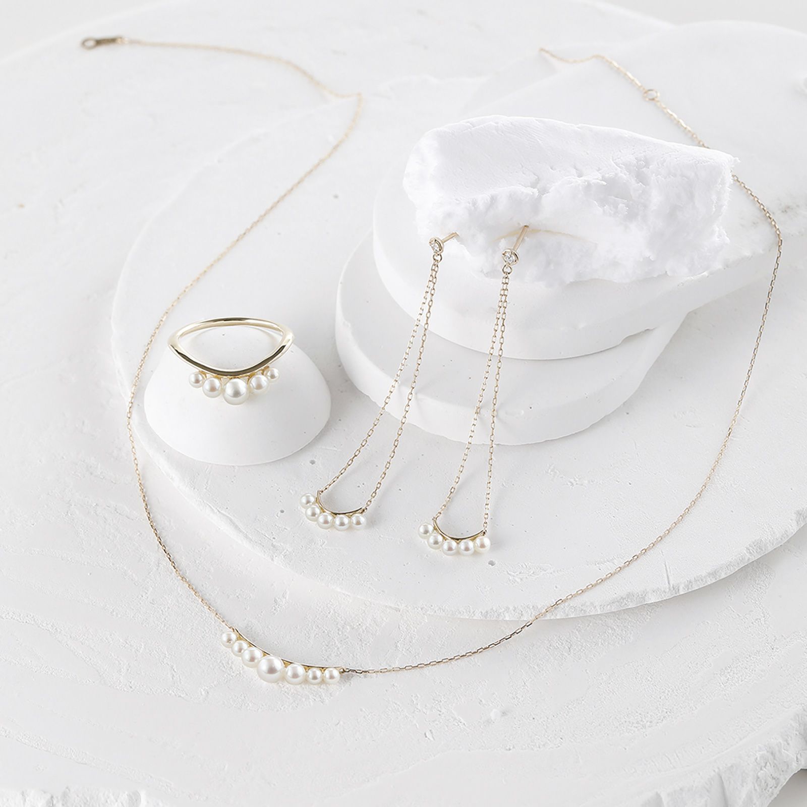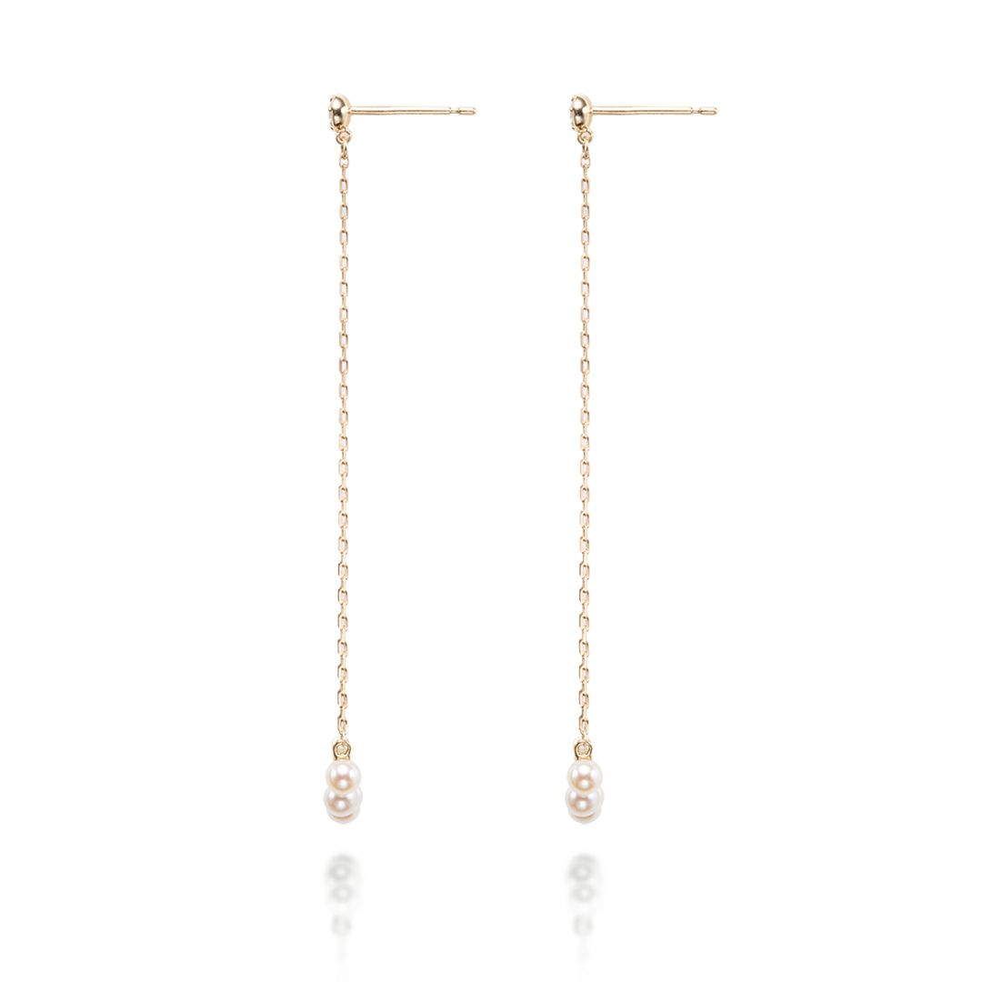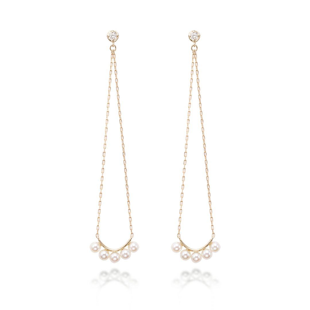 ベビーパールを5石並べた揺れるピアスです。大き目のモチーフですが透け感があるので重くなりません。たおやかなベビーパールの輝きをお楽しみください。