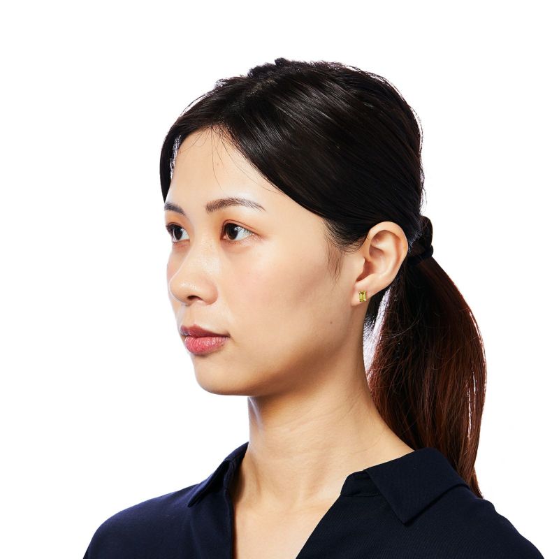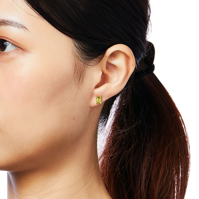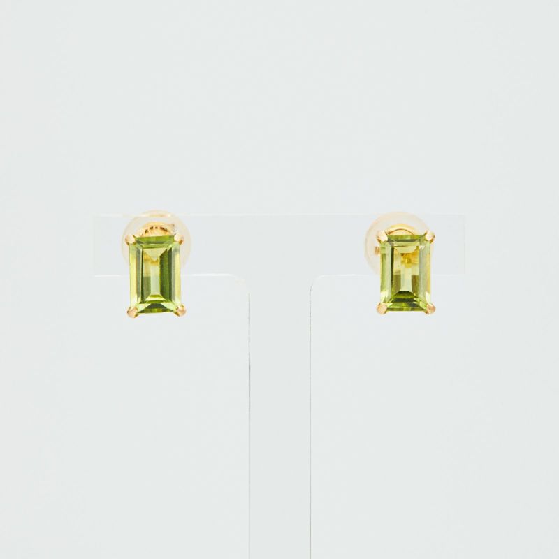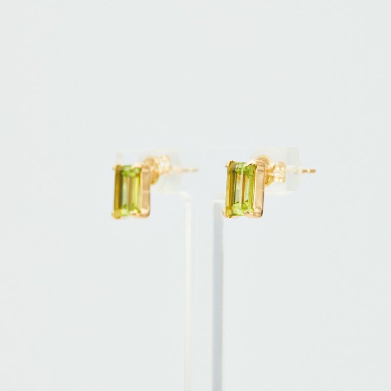 ペリドットのバゲットカットピアス。ペリドットの緑は案外肌なじみもよく、かつ華やかにも魅せてくれるのでスタイルを選ばず便利なアイテムです。