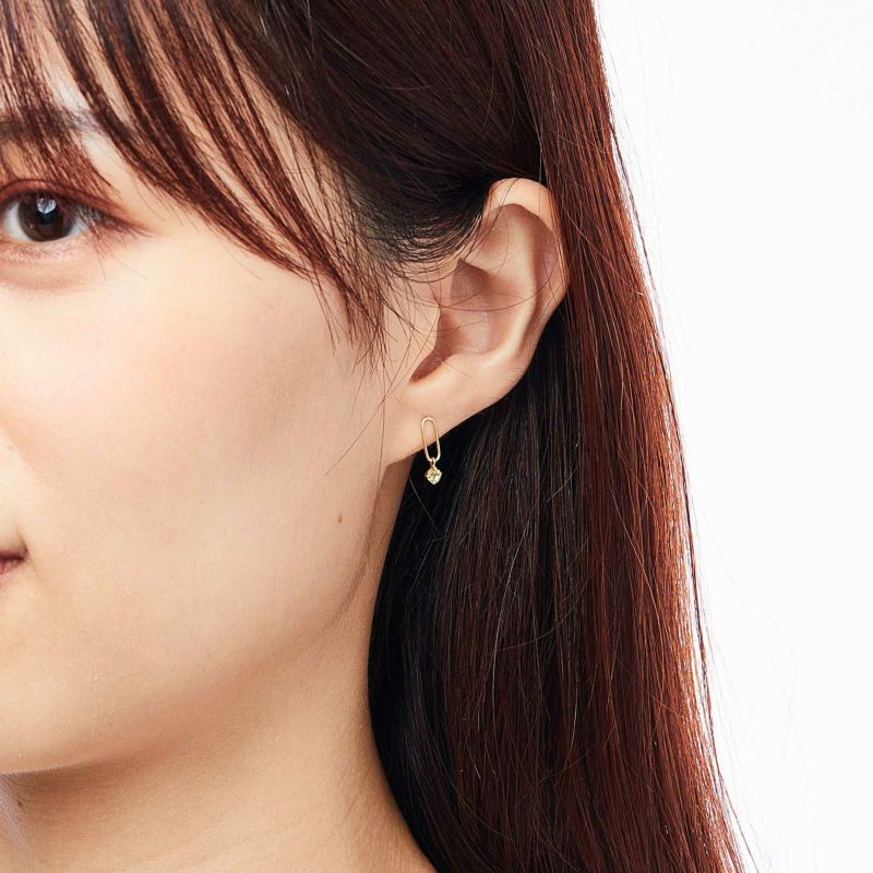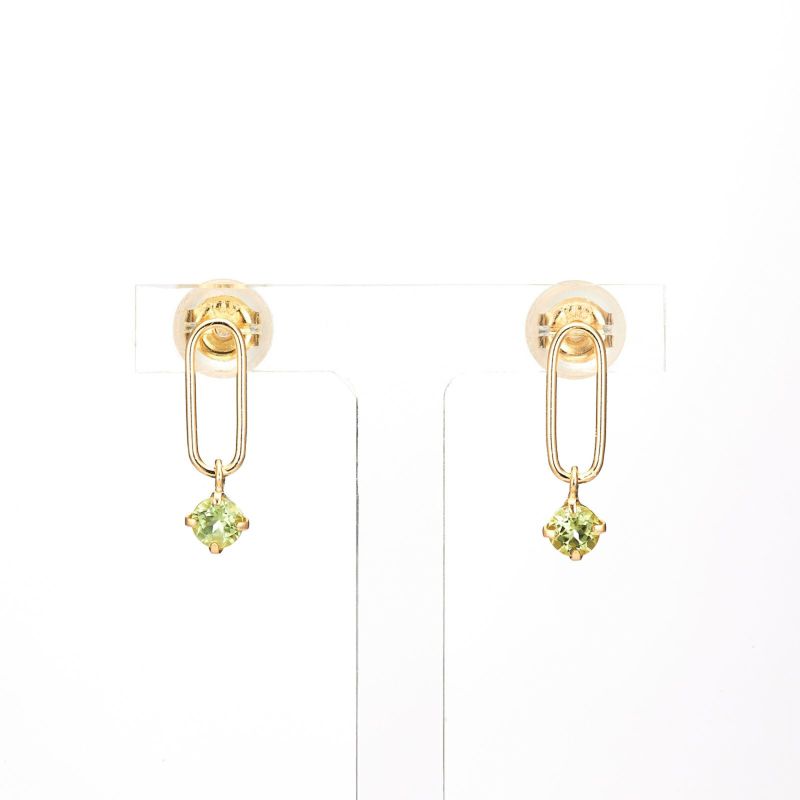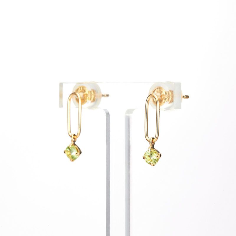 K18イエローゴールドのクリップ型モチーフにペリドットが1粒ついたピアス。ペリドットは固定されておらず、自由に動きキラキラと耳元で輝きます。