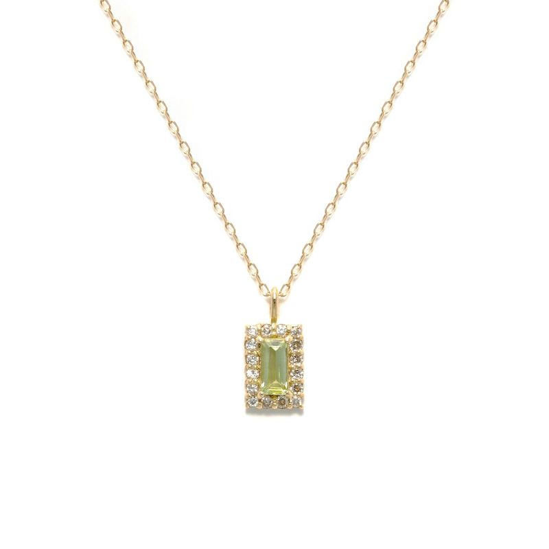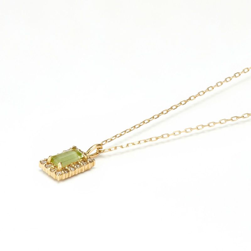 バゲットカットのペリドットがメレダイヤモンドとK18イエローゴールドのフレームで囲まれた美しいネックレス。さりげなく知的なアイテムです。