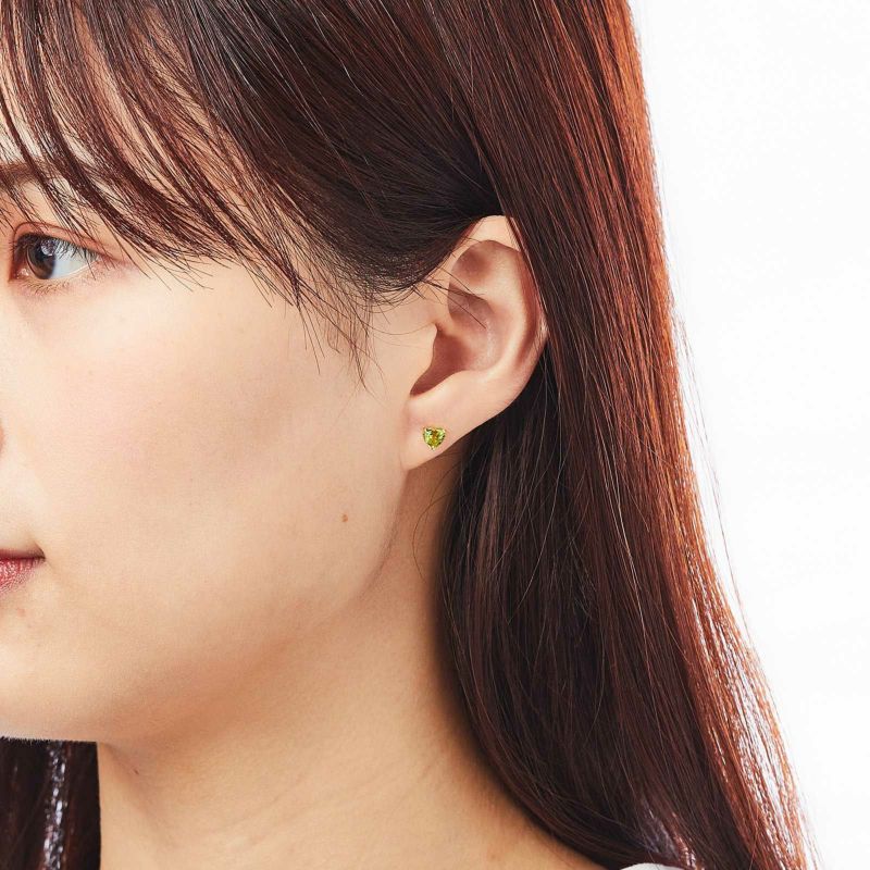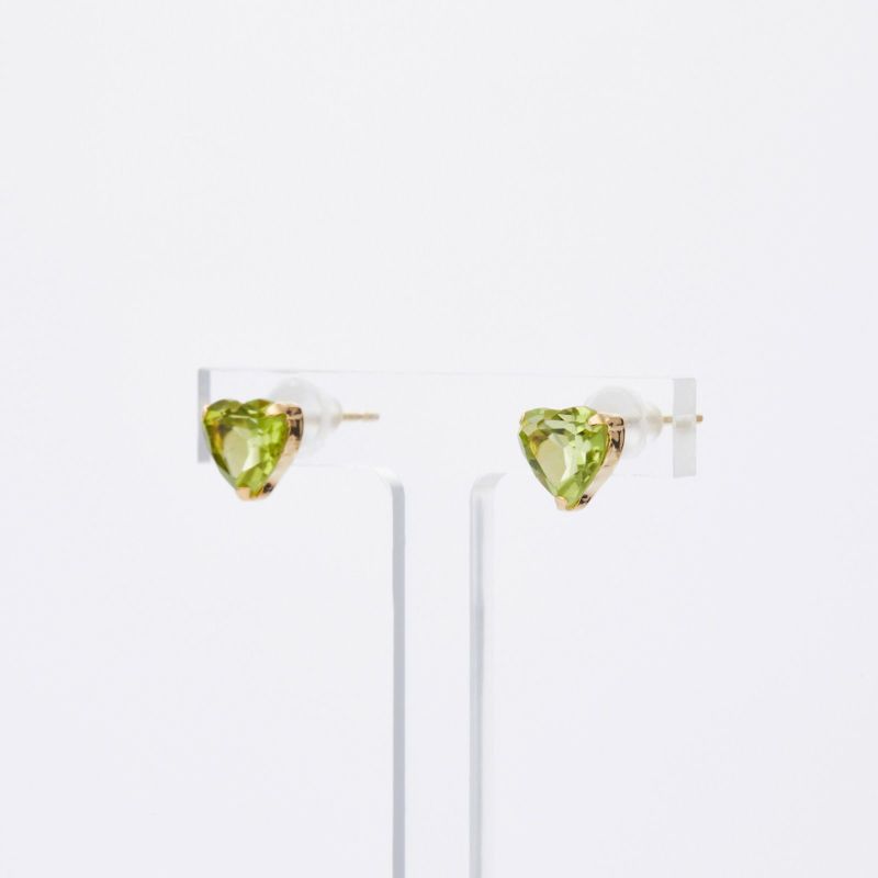 K18イエローゴールドのペリドットピアス。ハートシェイプのペリドットが可愛らしく、爽やかな色のピアスです。