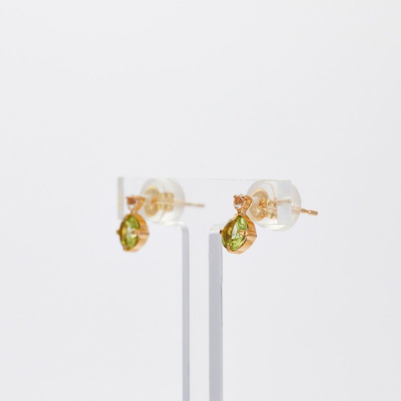 ラウンドカットのペリドットの上に、きらりと光る小さなホワイトトパーズがアクセント。顔周りにカラーストーンのジュエリーを使うと華やかな印象になります。フレッシュなマスカットのようなきれいなペリドットをぜひ耳元に。