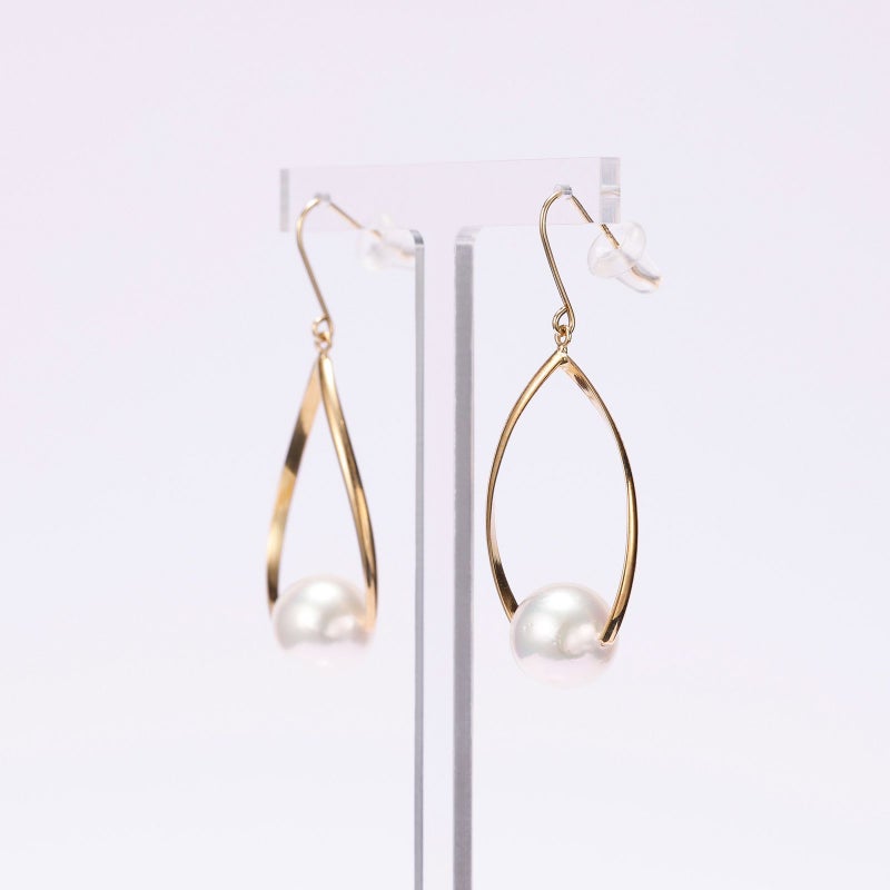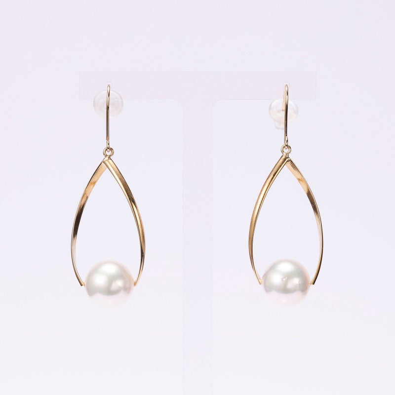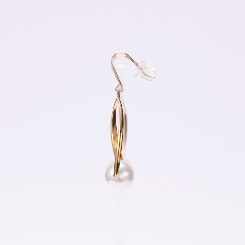 金属のモチーフにパールを留めて、上品なピアスに仕上げました。フックタイプでひねりを加えてありますので、とても品があり都会的な印象でお召いただけます。あこや真珠は一様な2珠を用意いたしました。照りがよく高級感を楽しんでいただけます。