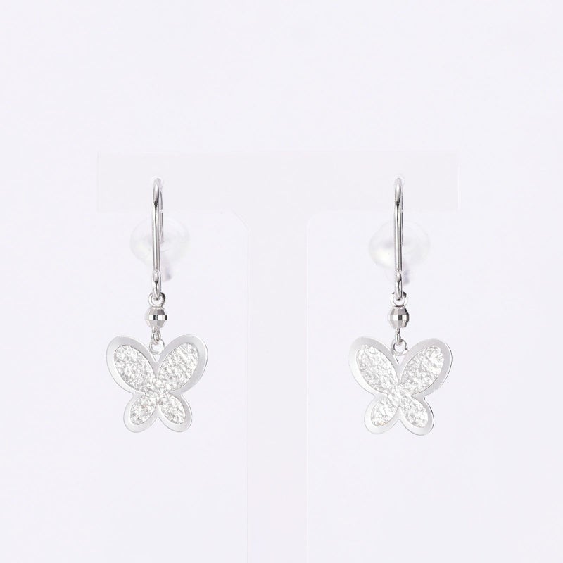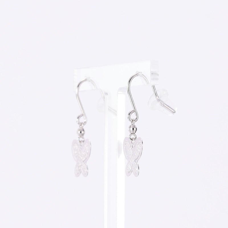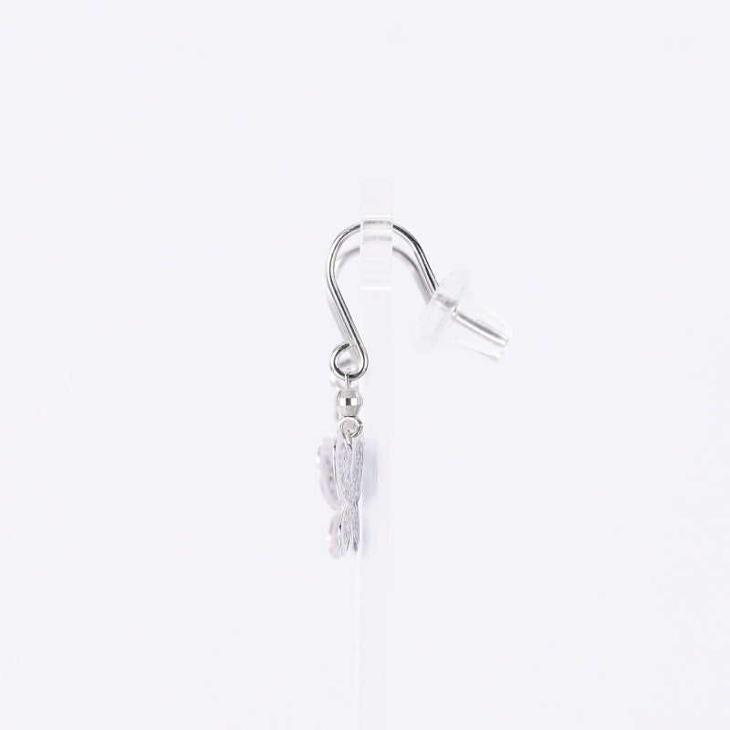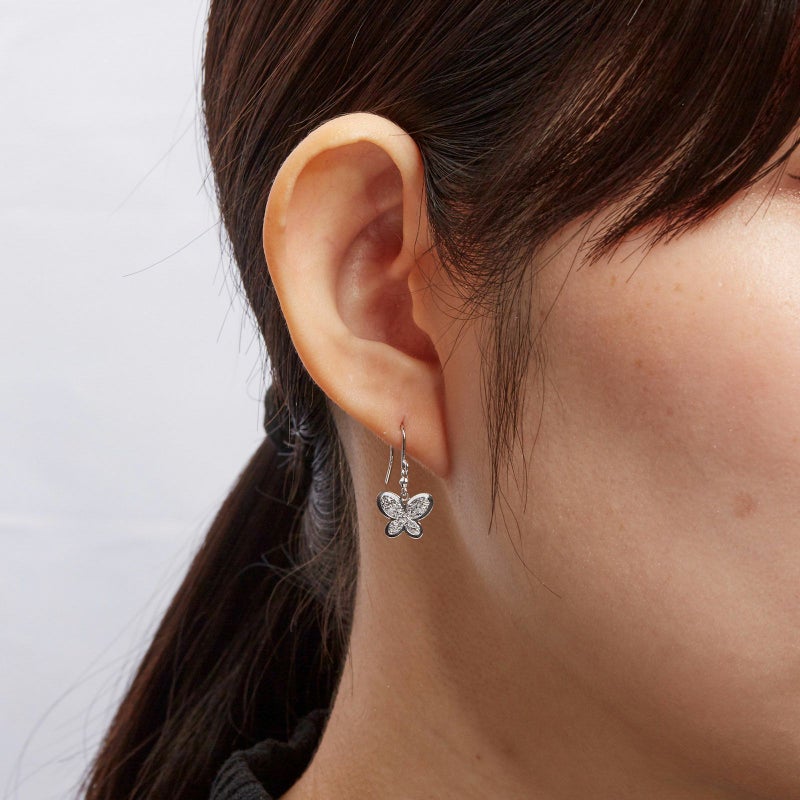 蝶のモチーフがぶら下がったピアスです。蝶のモチーフは飛翔や上昇という意味があります。左右対称の蝶のモチーフを耳回りで楽しんで下さい。