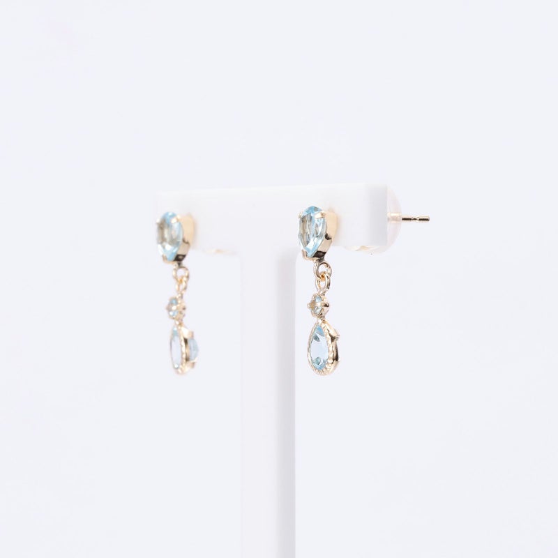2粒の涙型ブルートパーズと1粒のメレサイズのブルートパーズを動きのある揺れるピアスにしました。