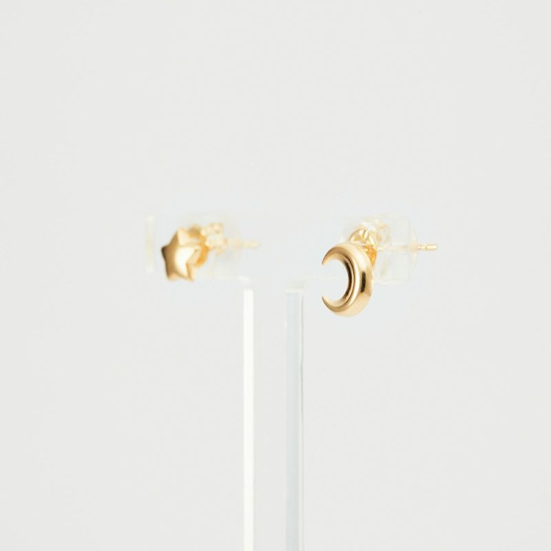 K18 イエローゴールドのピアス。片方はムーン、もう片方はスターという左右違うモチーフはいつもと違う雰囲気に気分が上がります。どちらに月を、どちらに星をつけるかというジンクスが生まれそうなアイテムですね。