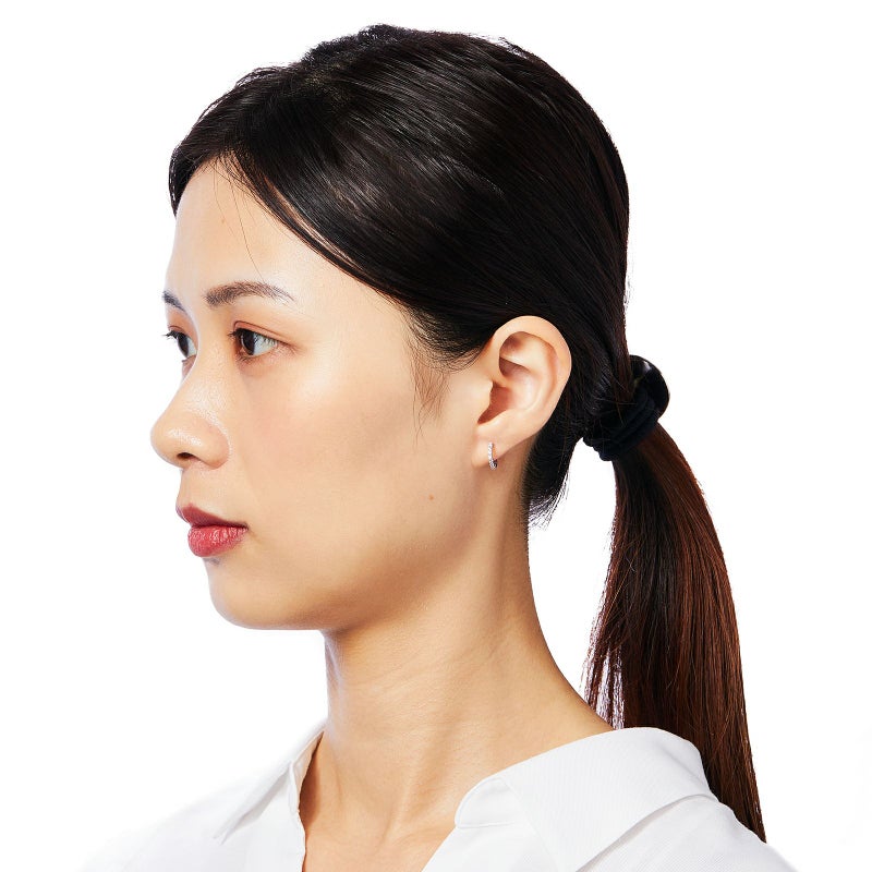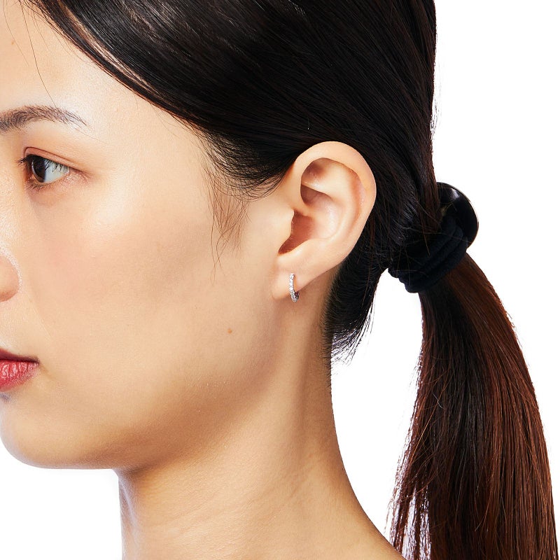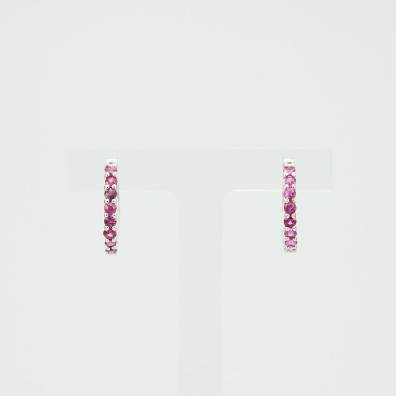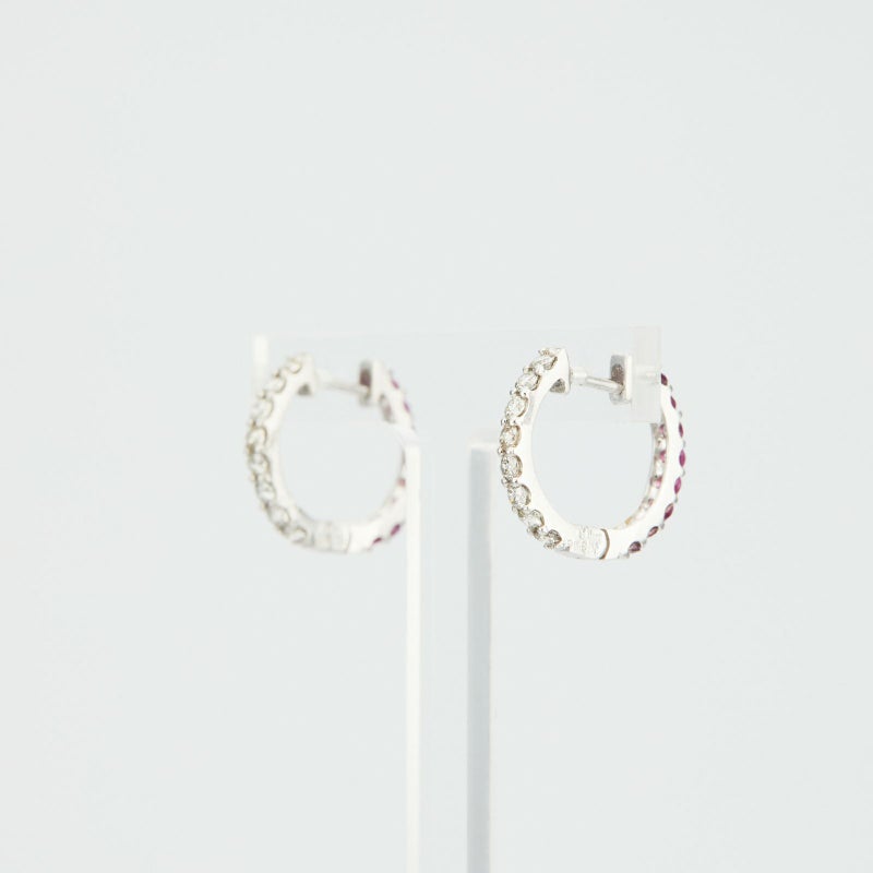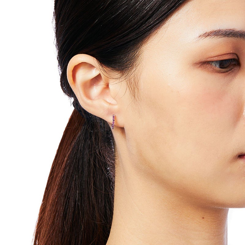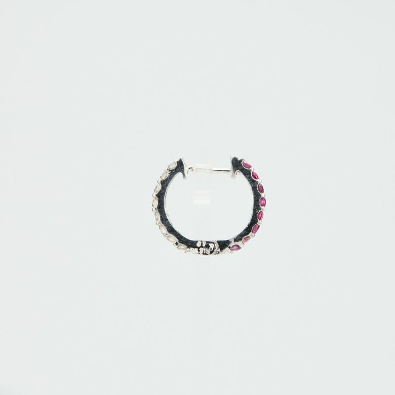ルビーとダイヤモンドのK18ホワイトゴールドリバーシブルフープピアス。全体的に色が足りないかな、アクセントが欲しいな、という時はルビーを、少し落ち着いた雰囲気にしたいな、という時はダイヤモンドを前面にして違う表情を楽しんでください。
