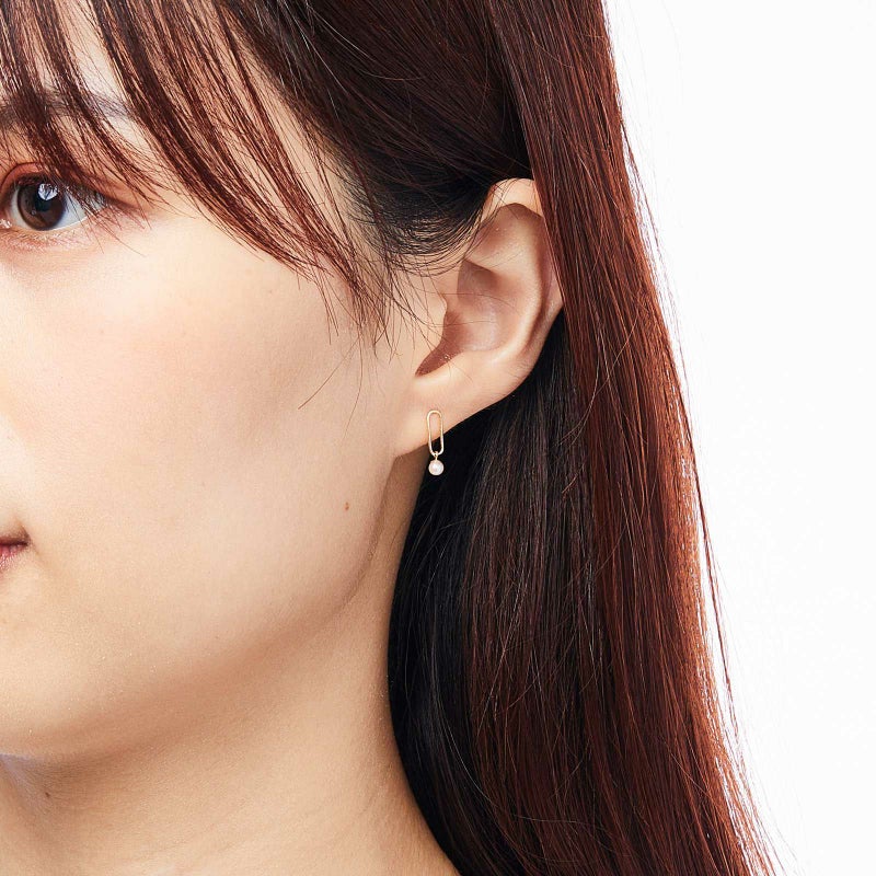 K18イエローゴールドのクリップ型モチーフにベビーパールが1粒ついたピアス。ベビーパールは固定されておらず、自由に耳元で動きます。