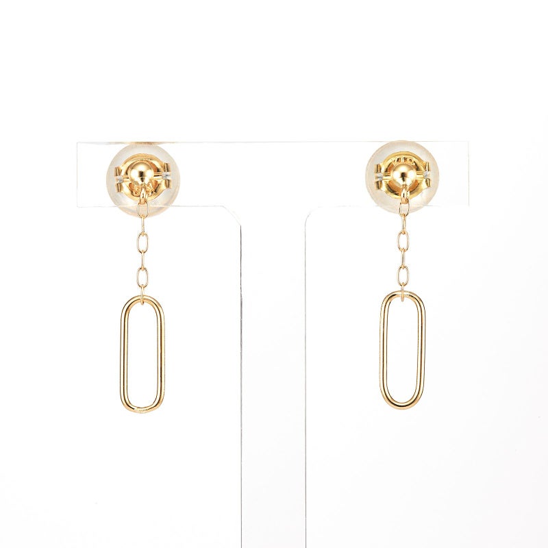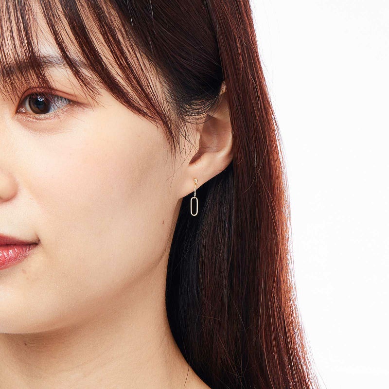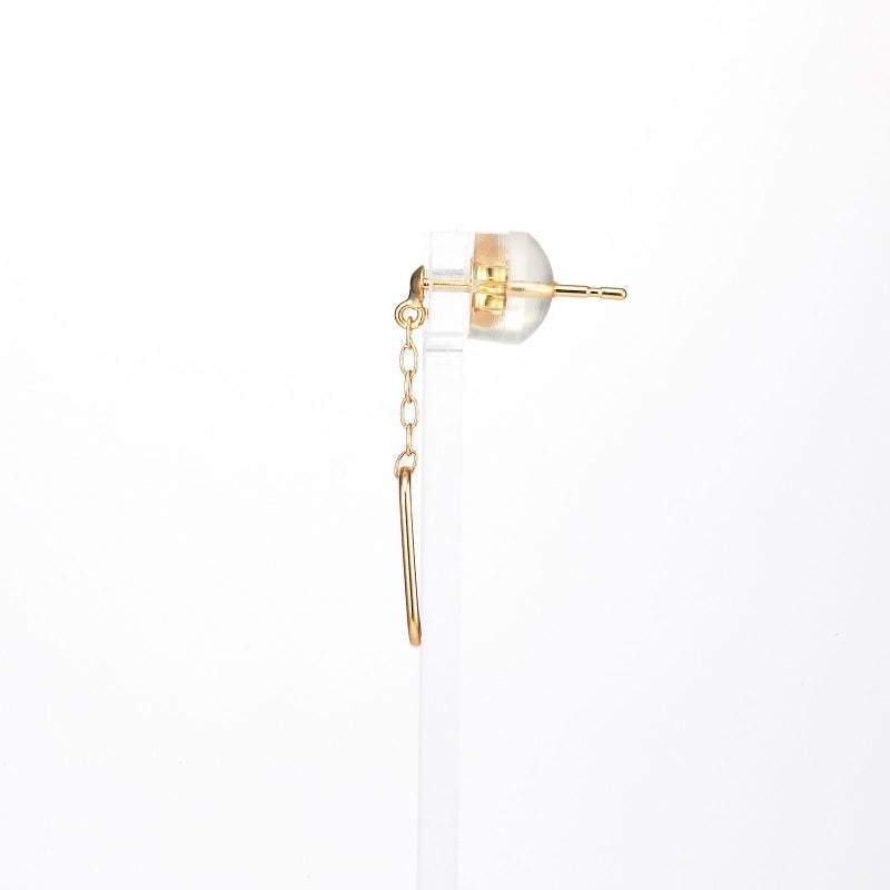 K18イエローゴールドピアス。繊細なチェーンにクリップ型のモチーフがぶらさがるタイプのデザインは合わせやすくて優秀なアイテムです。