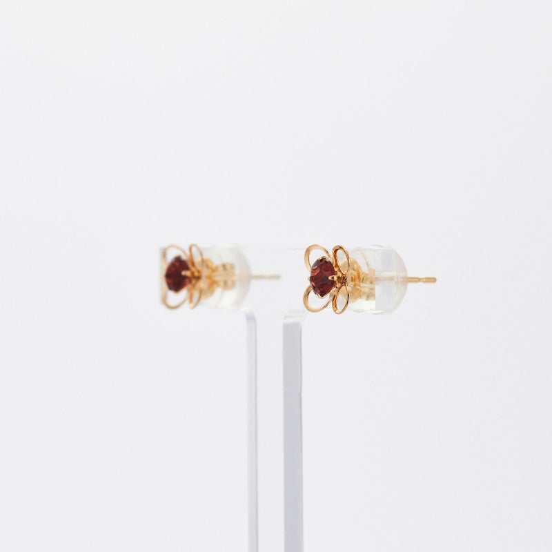 K18イエローゴールドのフラワーモチーフデザインのピアスです。4枚の花びらの中心にラウンドのガーネットが彩りを添えています。ガーネットの落ち着いた赤色が耳元を華やかに飾ります。