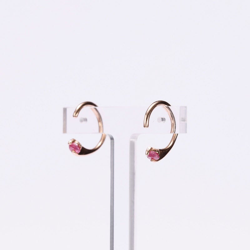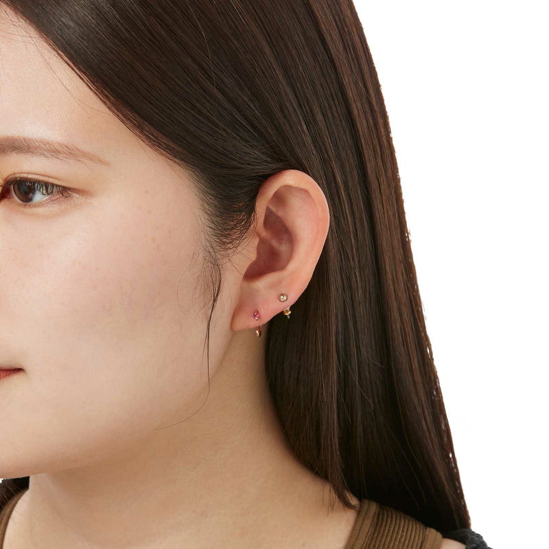全体の大きさが1cmほどの愛らしいピアスです。先端のハートのルビーがアクセントになっています。小さなフープのピアスと同じように使っていただける、さり気ないデザインです。