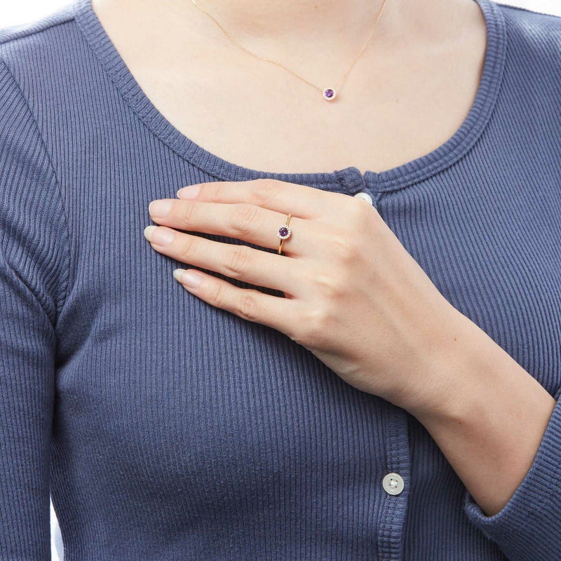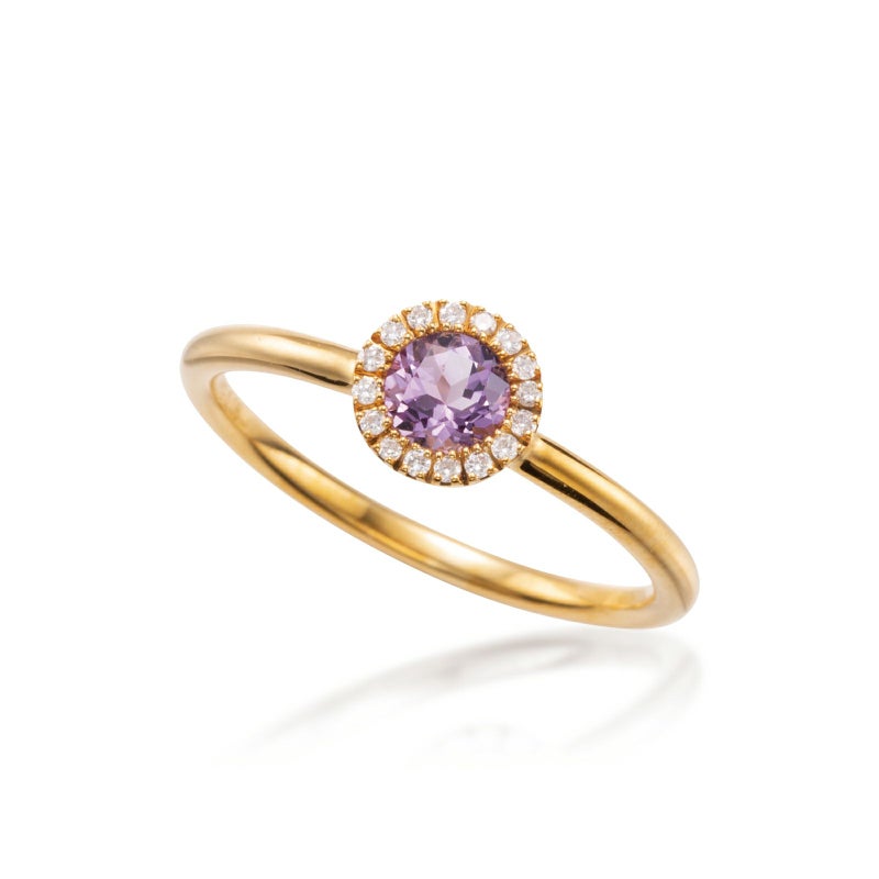 マイクロセッティングのメレダイヤモンドの中心に美しいカラーのアメジストを留めました。プレシャスという最愛の人という意味の名前が付けられたこちらのリングは、12ヶ月分のご用意がございます。お守り石としても、プレゼントとしてもご愛用下さい。