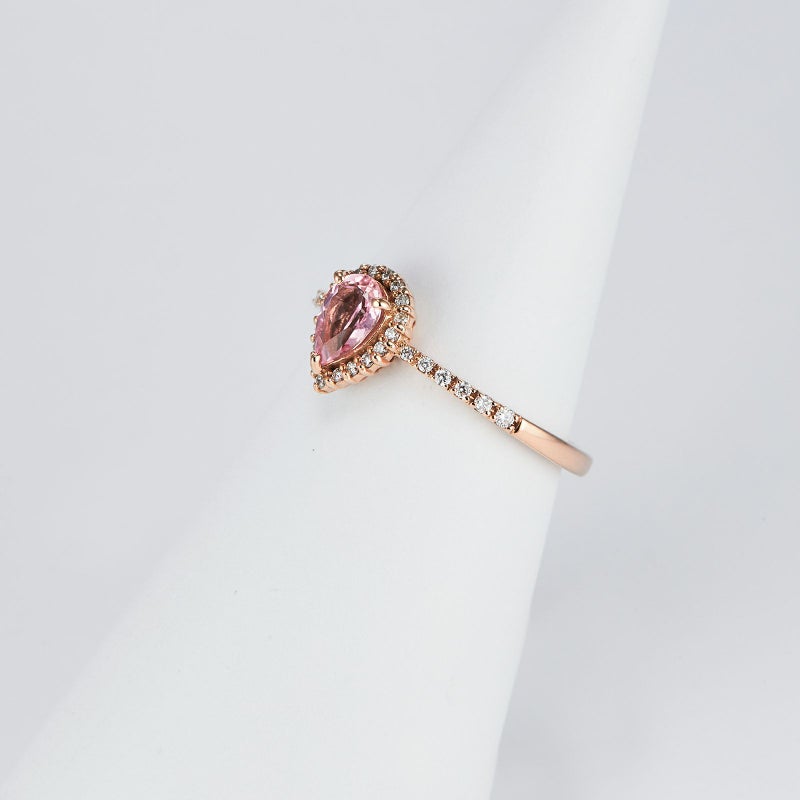 モルガナイトをダイヤモンドで囲んだ美しいリングです。新しく4月の誕生石に加わったモルガナイトは気品あふれる桜色がピンクゴールドとマッチした可愛さあふれるリングです。