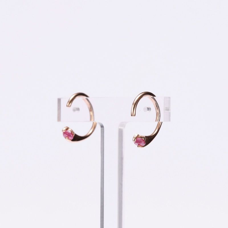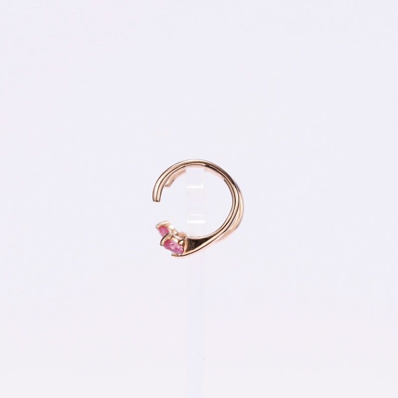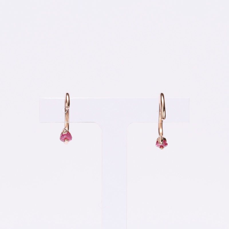 全体の大きさが1cmほどの愛らしいピアスです。先端のハートのルビーがアクセントになっています。小さなフープのピアスと同じように使っていただける、さり気ないデザインです。