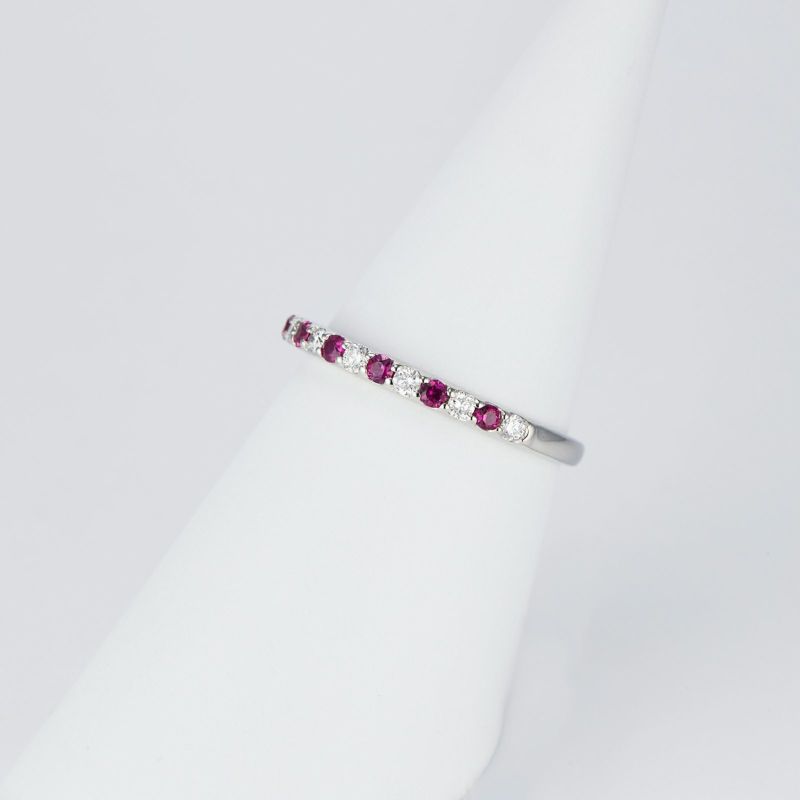 ルビーとダイヤモンドのハーフエタニティタイプのリング。ルビーの赤がアクセントになるので、重ね付けはもちろん1本使いにもおススメです。