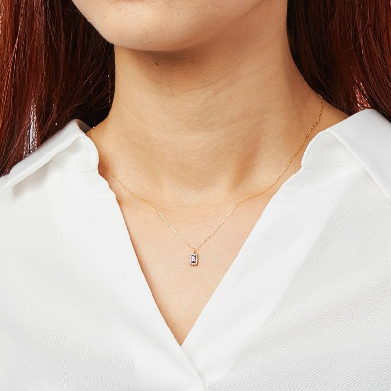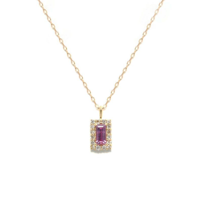 バゲットカットのルビーがメレダイヤモンドとK18イエローゴールドのフレームで囲まれた美しいネックレス。さりげなく可憐なアイテムです。