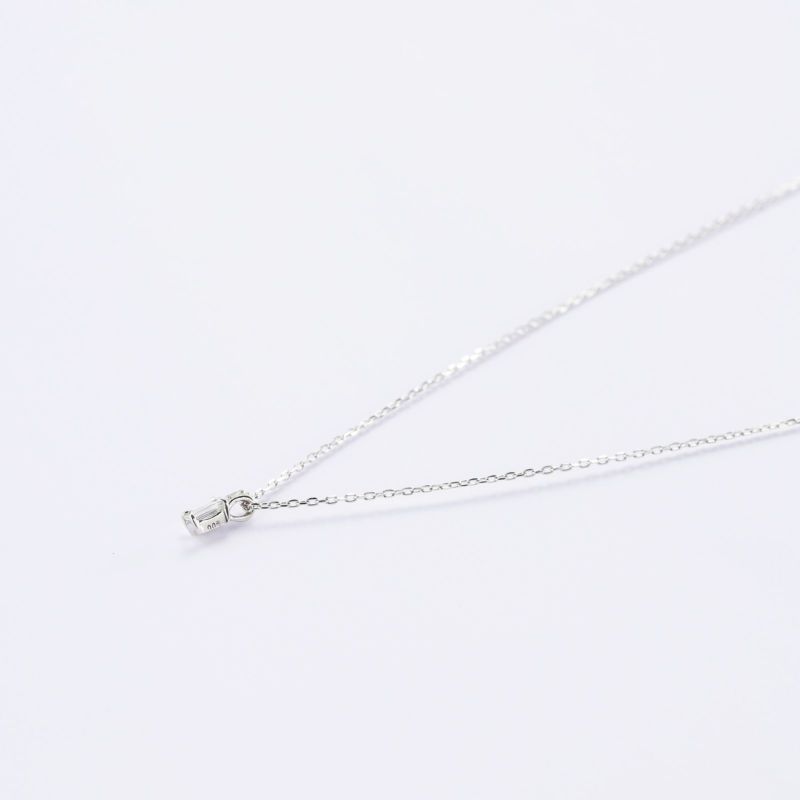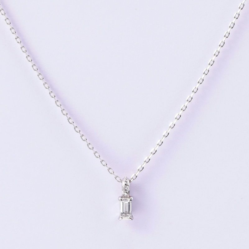 バケットカットのダイヤモンドを1石使った、品のあるネックレス。シンプルなダイヤモンドの輝きは、洗練された上品な印象に。