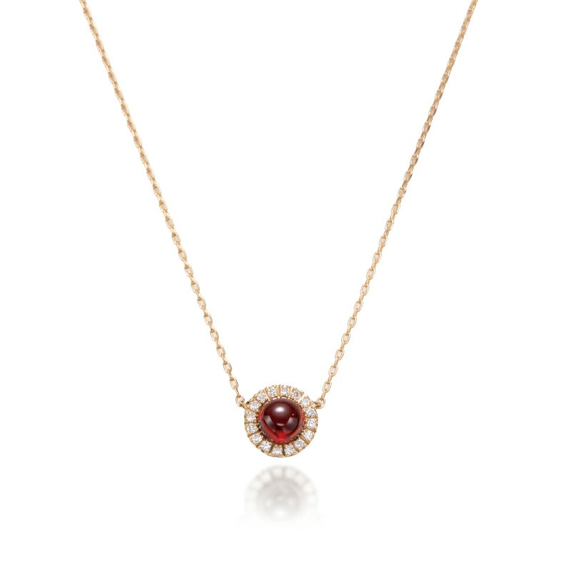 マイクロセッティングのメレダイヤモンドの中心に美しいカラーのガーネットを留めました。プレシャスという最愛の人という意味の名前が付けられたこちらのネックレスは、12ヶ月分のご用意がございます。お守り石としても、プレゼントとしてもご愛用下さい。
