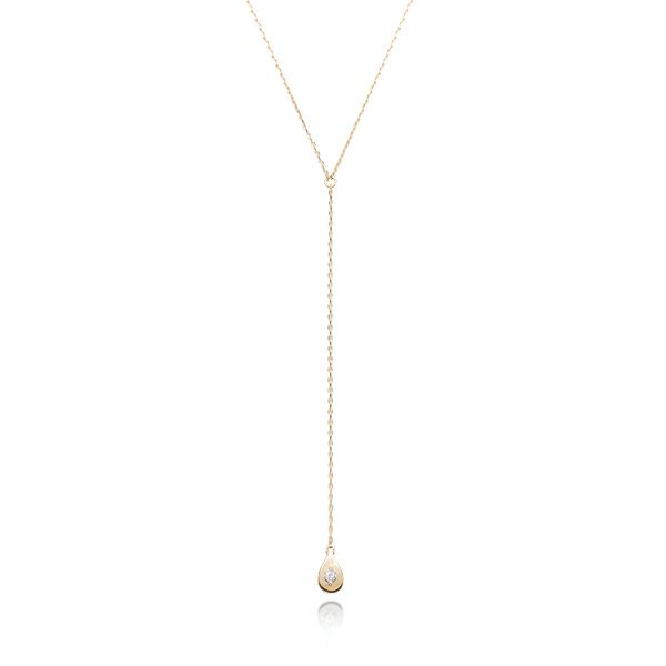 ペアシェイプのゴールドパーツがダイヤモンドを際立たせ、動くたびに揺れるチェーンが人の心を捉えて離さない。印象的でエレガントなデザイン。