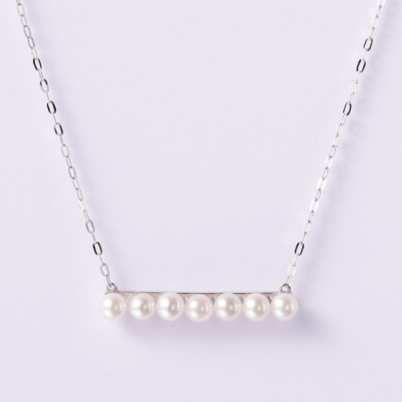 7石のあこやベビーパールを並べたネックレスです。小ぶりなベビーパールが直線に並び、洗練された印象でお召いただけます。ベビーパールの色味をそろえていますので、一様に美しい色味を楽しんでいただけます。