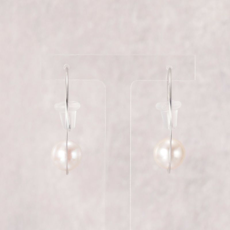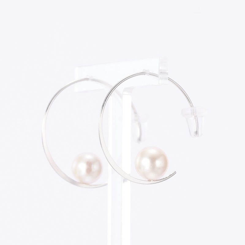 K18ホワイトゴールドのフープにパールがついたピアス。6mmのパールが華奢なホワイトゴールドについたデザインはとても芸術的です。