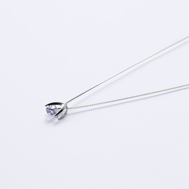 末広がりのモチーフにタンザナイトが留まっているダンシングストーンネックレスです。美しい紫色の石が胸元でキラキラ揺れます。ダンシングストーンならではの揺れるセッティングをお楽しみください。