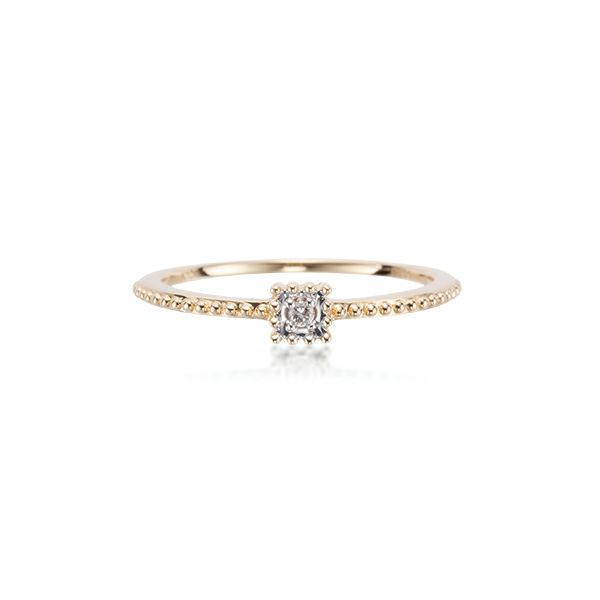 キラキラ輝くダイヤモンドを小粒なミルが取り囲んだスクエアタイプのリング。甘すぎずクールすぎないデザイン。