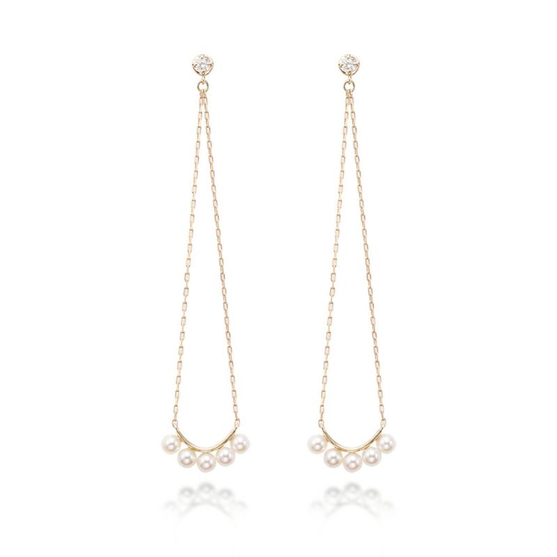 ベビーパールを5石並べた揺れるピアスです。大き目のモチーフですが透け感があるので重くなりません。たおやかなベビーパールの輝きをお楽しみください。