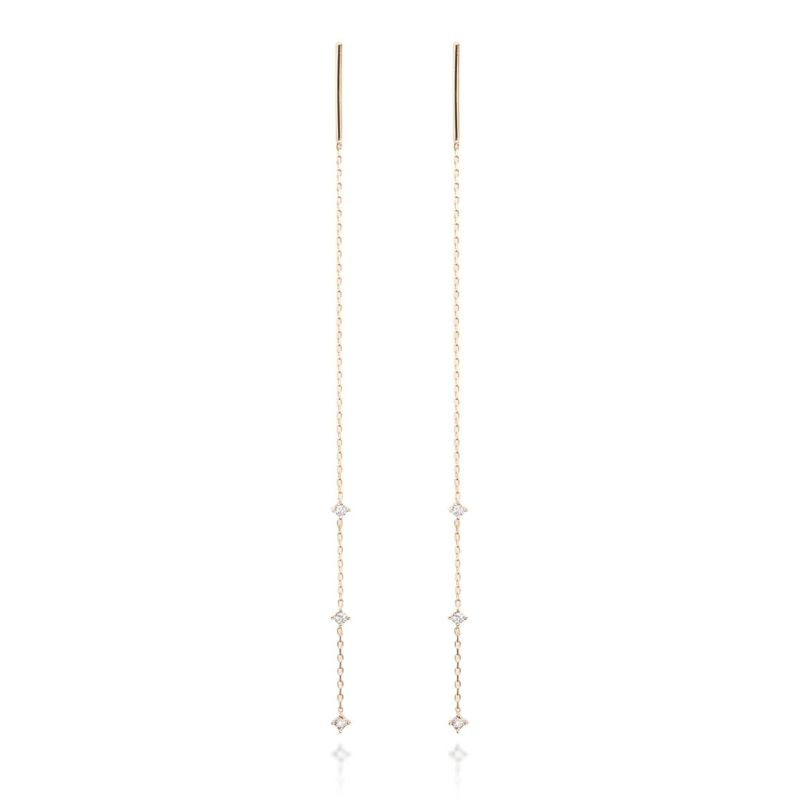 イエローゴールドのステーションピアスをデザインしました。サラサラ揺れるピアスは、フェミニンな装いです。上品なピアスはどんな場面でもお召いただけます。