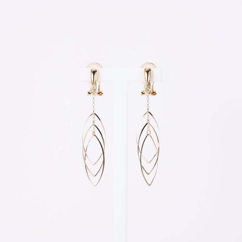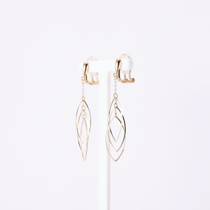 リーフのモチーフを3枚重ねたイヤリングをデザインしました。絶妙にかみ合った3枚のモチーフは、長めに揺れ女性らしさの象徴となります。