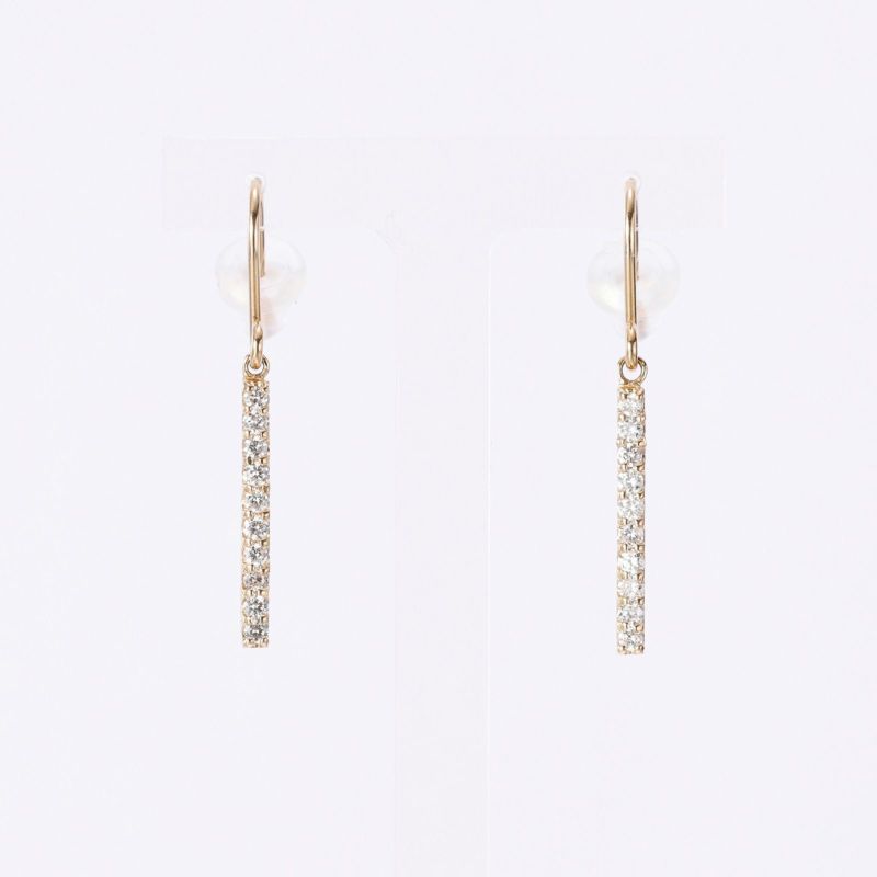 K18イエローゴールドのラインバーを使って、揺れるピアスをこしらえました。まっすぐに並んだダイヤモンドは、都会的な印象です。とてもスタイリッシュにお召し頂けます。