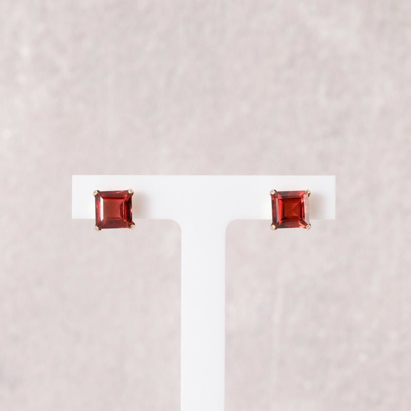 スクエアのガーネットをK18イエローゴールドのピアスに仕上げました。シンプルなピアスは天然石の色味を楽しんで頂けるよう、最小限の装飾にしてあります。赤い美しい質感をお楽しみください。