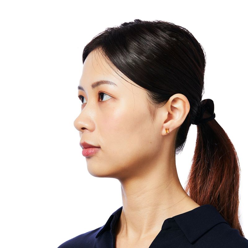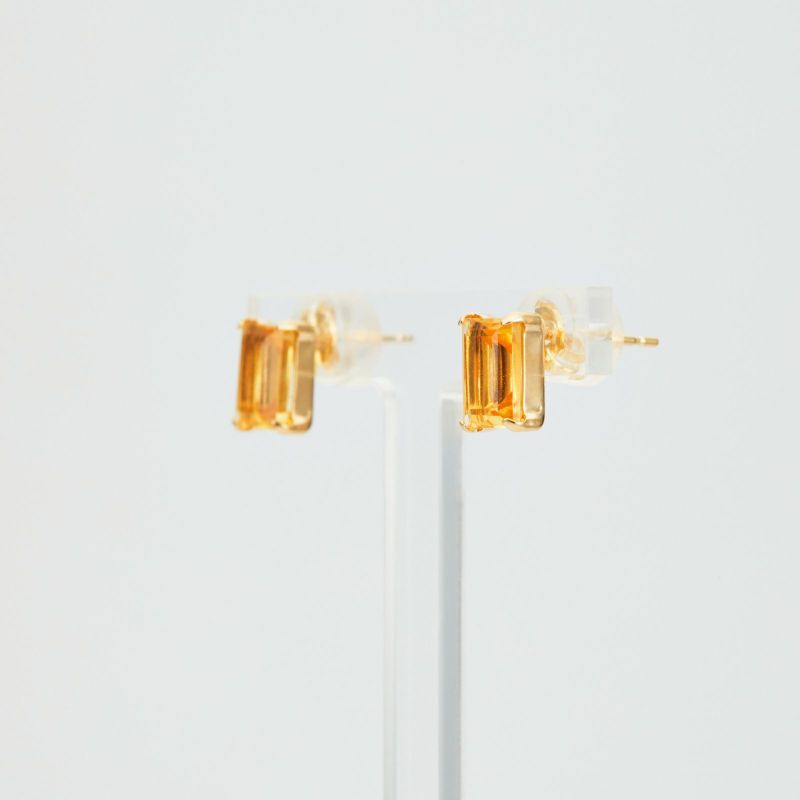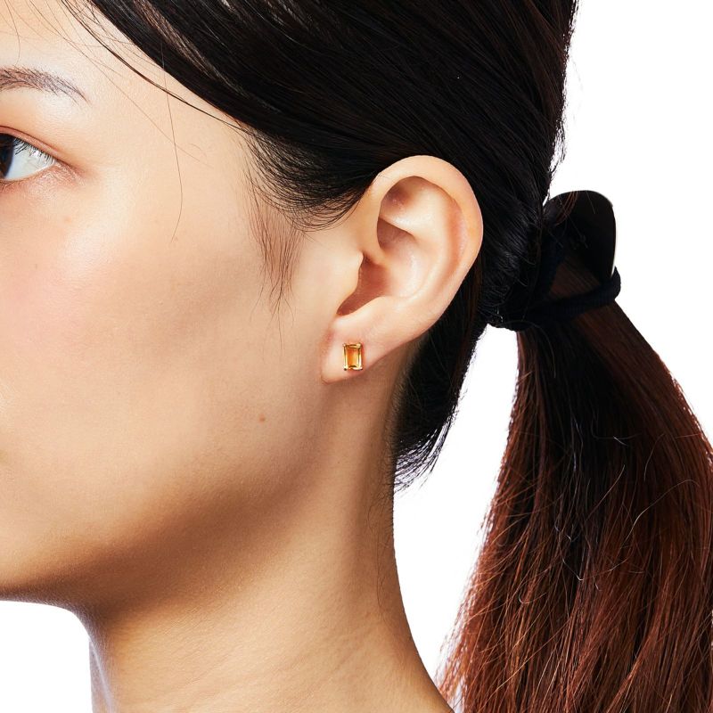 シトリンのバゲットカットピアス。大きめですが、シトリンは肌なじみがいいので派手になりすぎず、でも華やかさは演出してくれるのでオンオフ問わずお使いいただけます。